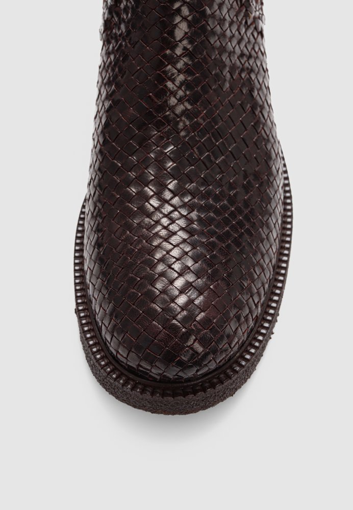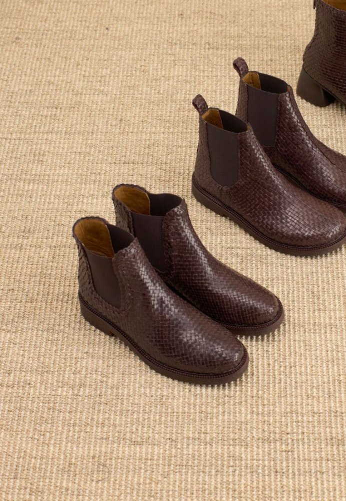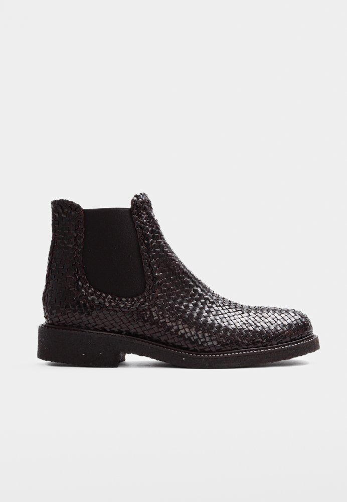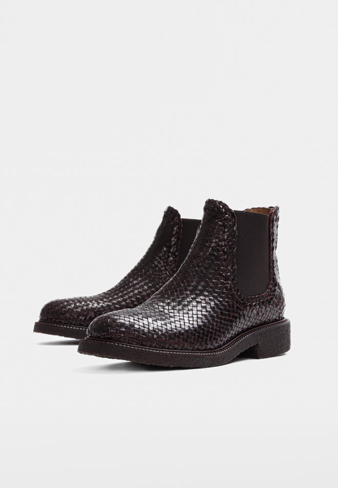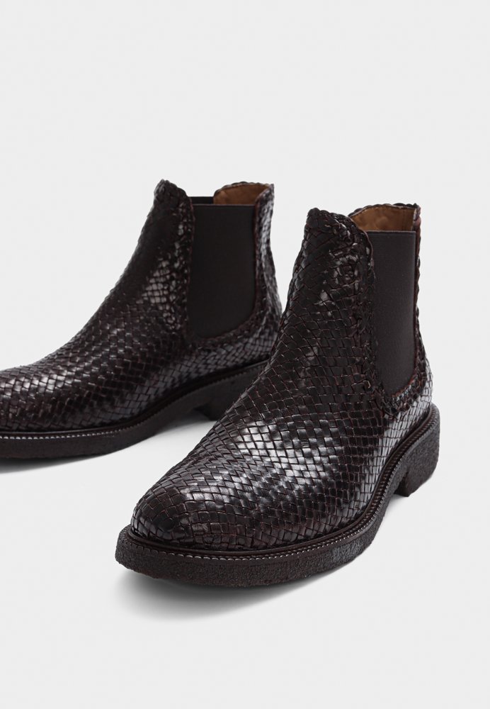Eksklusiv Chelsea-støvle i håndflettet læder med lavt skaft. Støvlen har en rundet snude, funktionel ribelastik i siderne, polstret indersål og kromfrit læderfoer. Ydersålen er en let, blød og fleksibel sort rågummisål lavet af FSC-certificeret fornybar naturgummi og afsluttes med en dekorativ rand. Dette er et naturprodukt – overdelen er udformet i vegetabilsk garvet læder og håndvævet i Indien, hvilket gør hvert par unikt. Farve og mønster kan derfor variere en smule. Vi anbefaler at behandle støvlerne med omhu og imprægnere jævnligt.