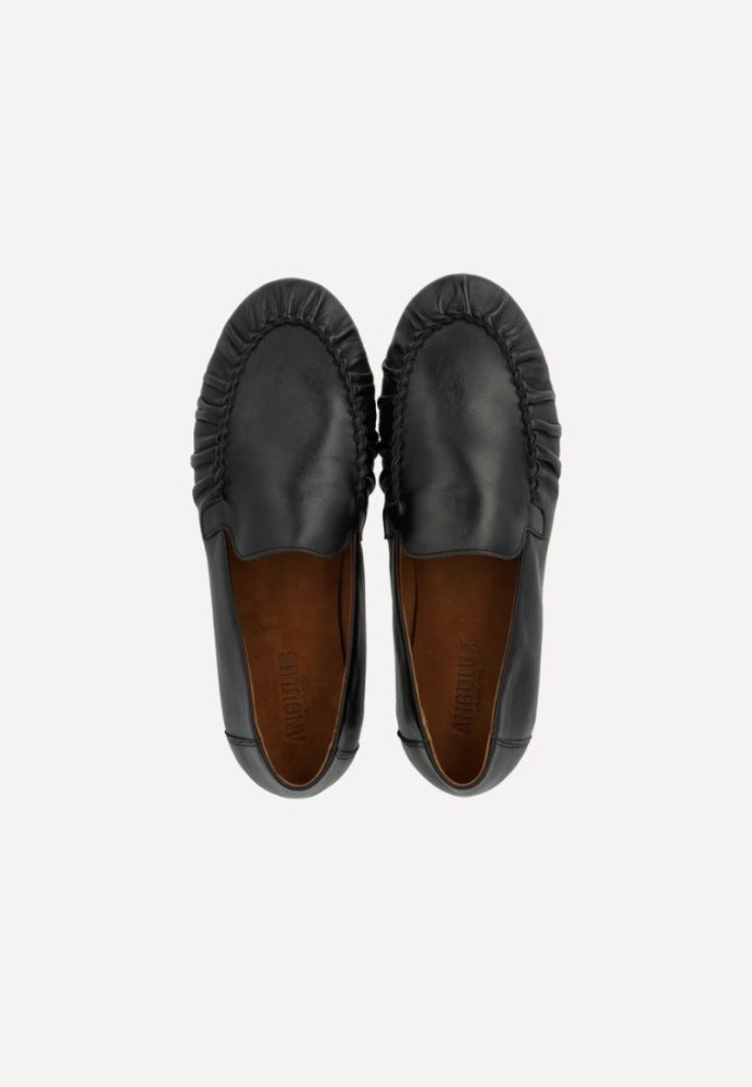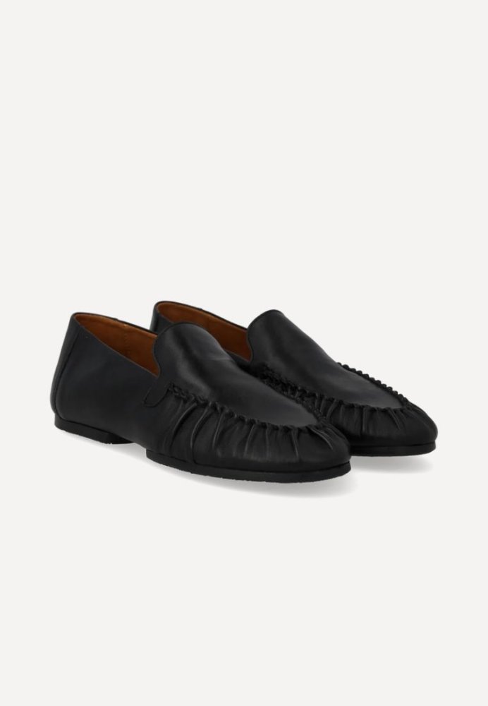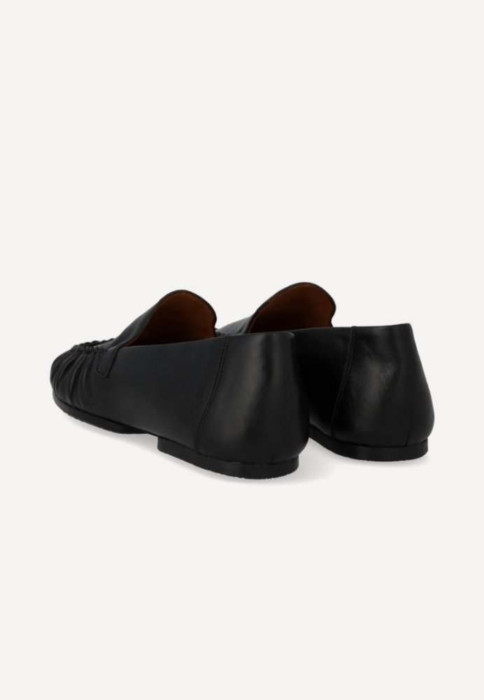 Ekstra blød og minimalistisk mokkasin i skind med dekorative rynkedetaljer. Skoen har rund snude, blød hæl- og tåkappe, polstret indersål samt foring i kromfrit ruskind. Den er afsluttet med en let, blød og fleksibel sort ANGULUS-logo gummisål, som giver høj komfort og stabilitet. Fremstillet i naturligt og åndbart skind. Designet i Danmark og håndlavet med kærlighed i Portugal.