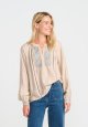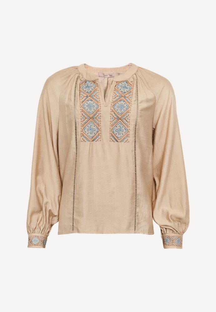 Emilie Shirt er en elegant skjorte i en blød blanding af 80% rayon og 20% nylon med smukke broderidetaljer. Farven Sand W/Embrodery giver et lyst og stilfuldt udtryk, perfekt til både hverdag og fest.
