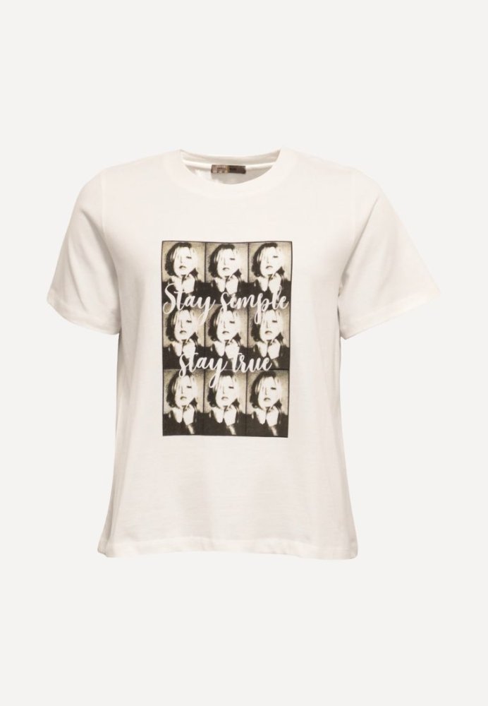 Grafisk minimalisme møder afslappet elegance i denne T-shirt med kunstnerisk print. Den rene silhuet og den lette kvalitet skaber en tidløs base, mens motivet tilfører karakter og moderne attitude. Perfekt til lag-på-lag styling eller som et statement alene.