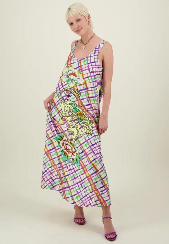 Wauw! En showstopper af en kjole fra Me369. Kjolen er let og luftig i sin kvalitet, som gør den perfekt til sommer stylet til et par fine sandaler. Kjolen har to unikke print - fortil en løve og blomster på et ternet print, hvor du bagtil har geometrisk mønster i en masse prangfarver.