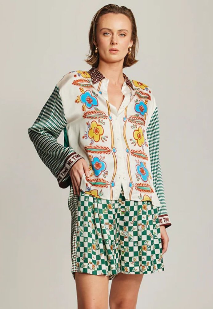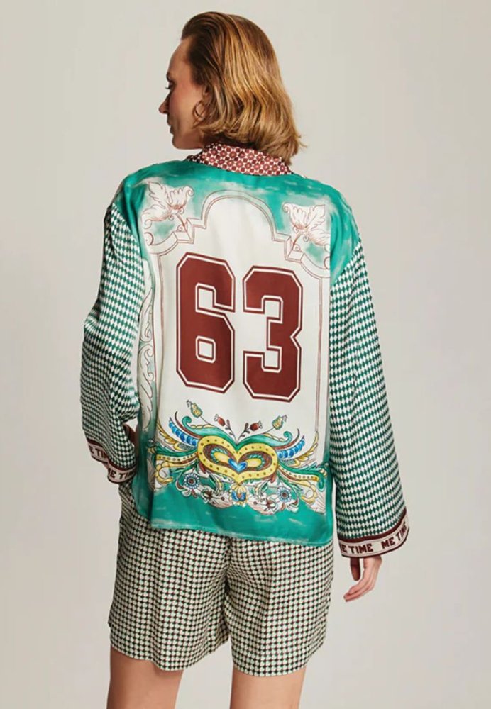Oversized skjorte i Sporty Jade-print med klassisk knapstolpe og afrundet bund – stilren og cool med maximale ærmer.