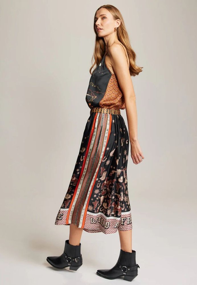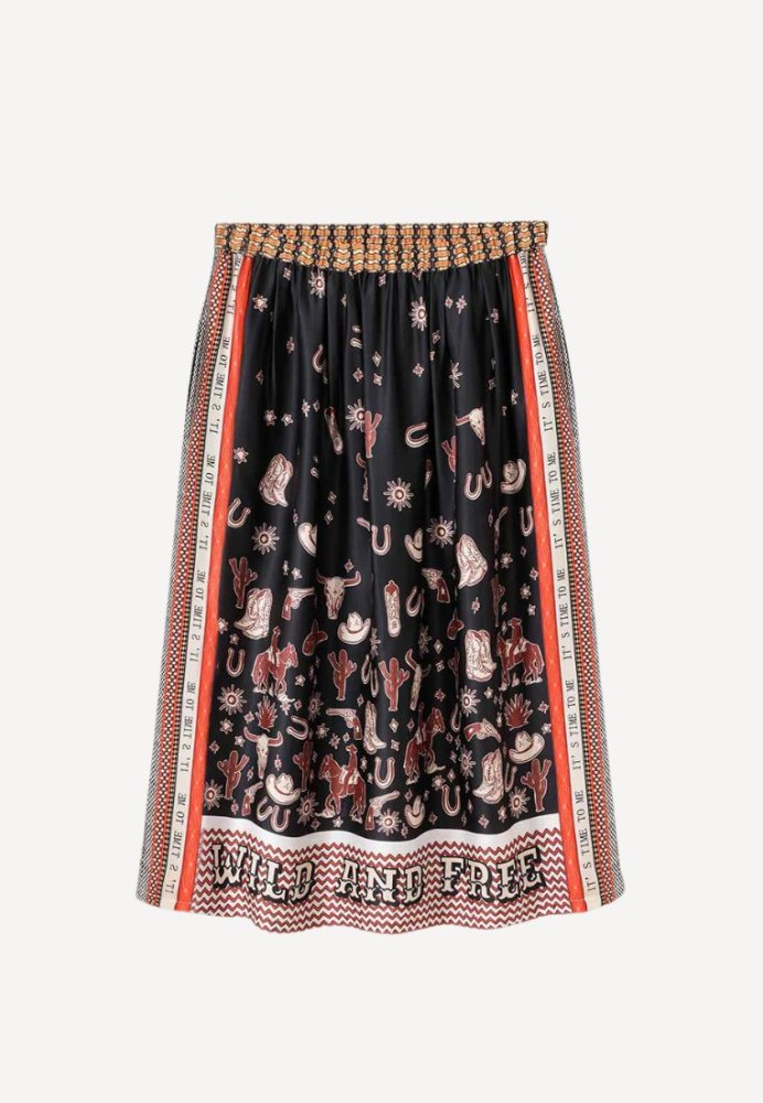 Let og fuldendt midi-nederdel med elastik i taljen og flydende skær – det dekorative Rodeo-print giver et romantisk og kunstnerisk udtryk.