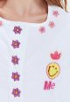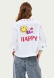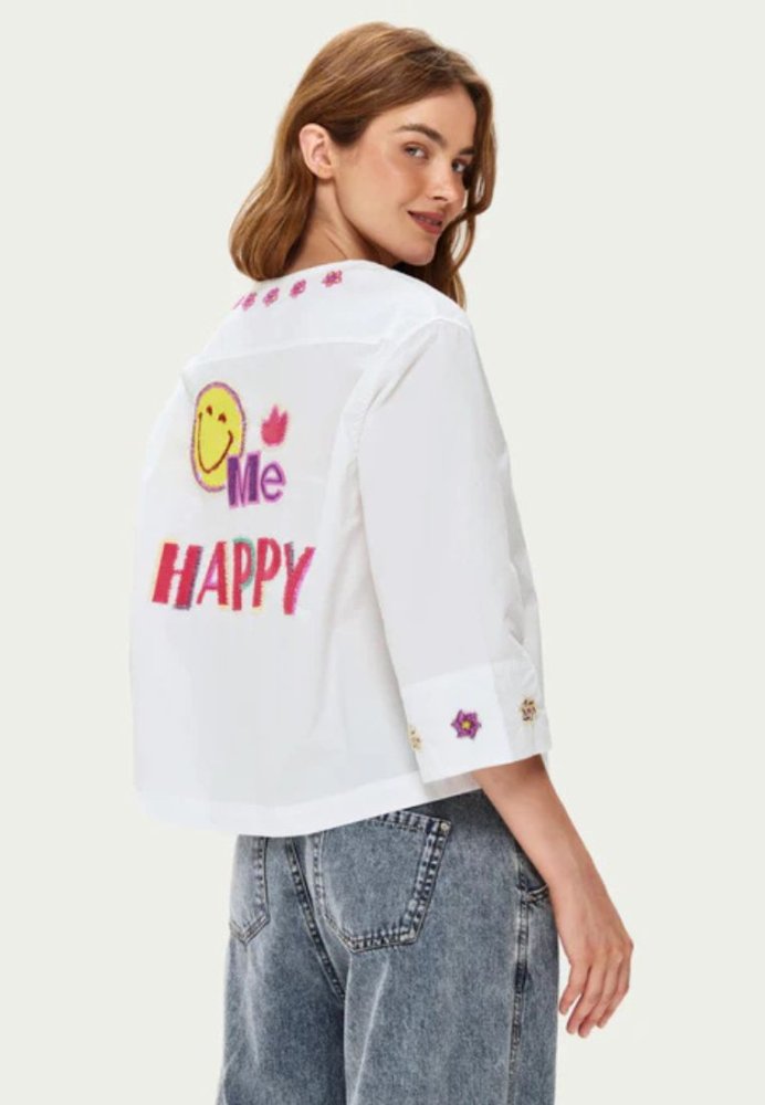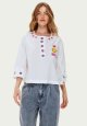 Blusen er dekoreret med farverige broderier både foran og på ryggen, som tilfører personlighed og et kunstnerisk twist. De fine blomsterdetaljer langs udskæringen og stolpen skaber en feminin kontrast til det grafiske motiv på ryggen, der giver et cool statement-look.