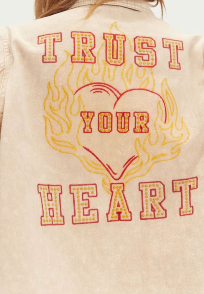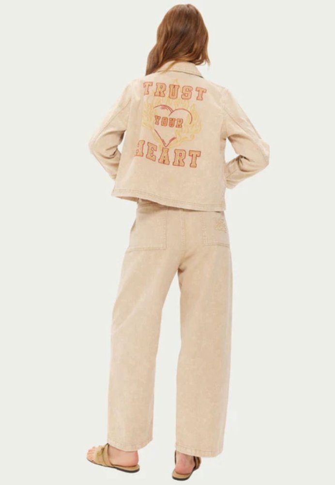 Jakken skiller sig ud med sit iøjnefaldende print på ryggen med teksten “Trust Your Heart” kombineret med grafiske detaljer, som tilfører et legende og personligt twist. De små tekst- og broderidetaljer foran understreger det gennemførte design og giver jakken karakter.