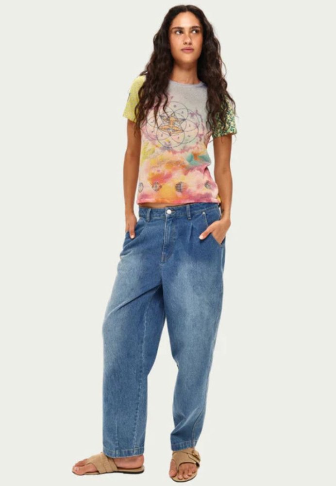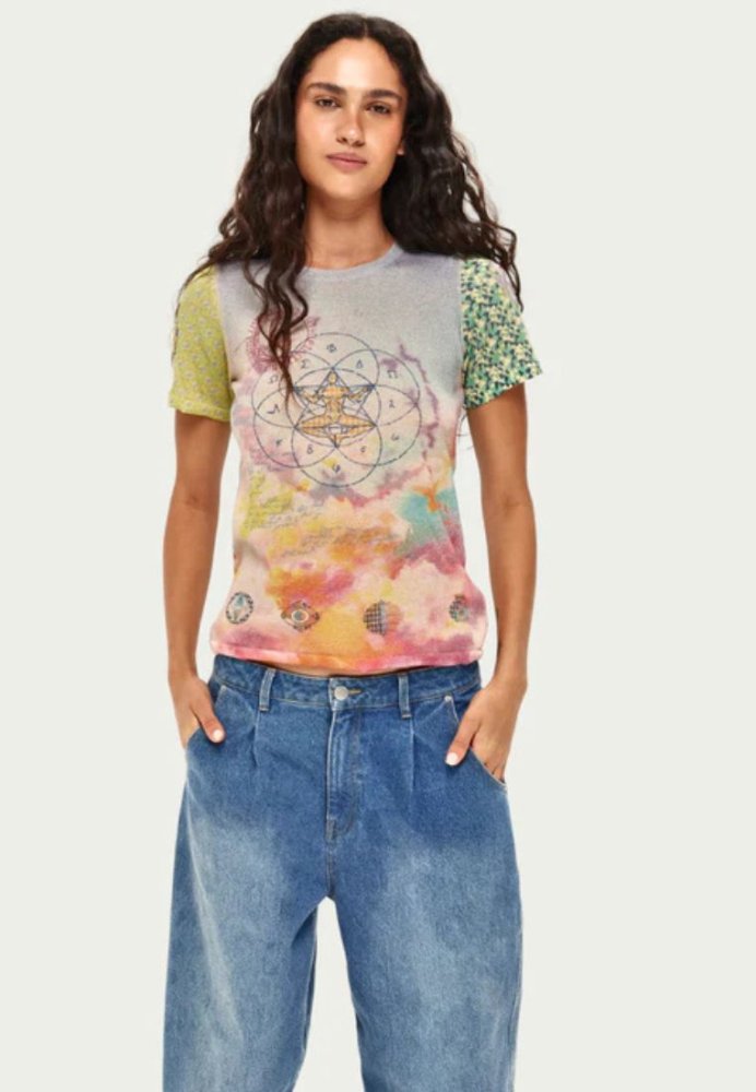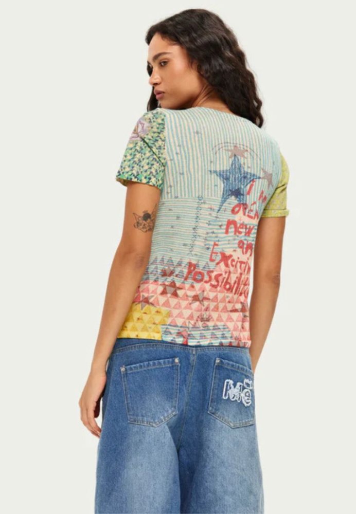 T-shirten er dekoreret med et levende mix af print og grafiske elementer i forskellige farver og mønstre, der tilsammen skaber et legende og personligt look. Det detaljerige motiv foran kombineret med kontrastfyldte ærmer og print på ryggen gør den til et iøjnefaldende statement-piece.