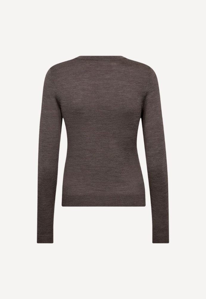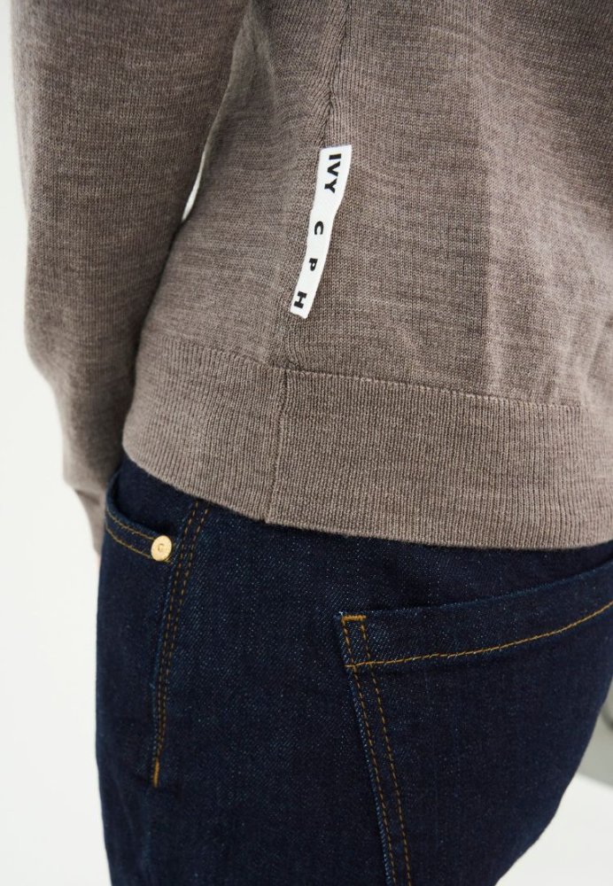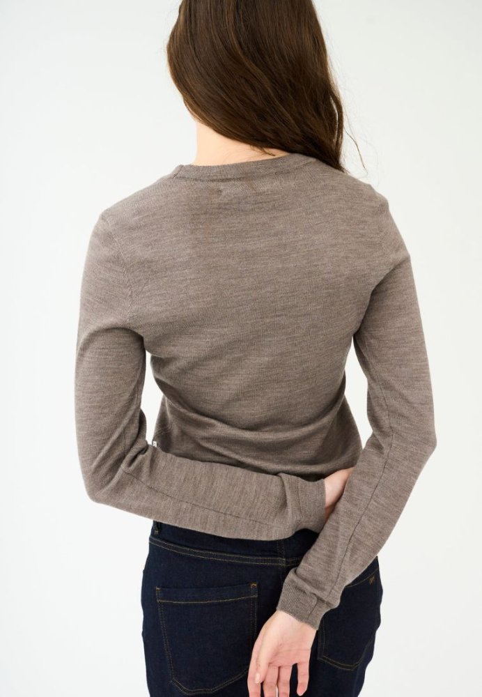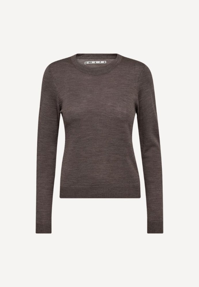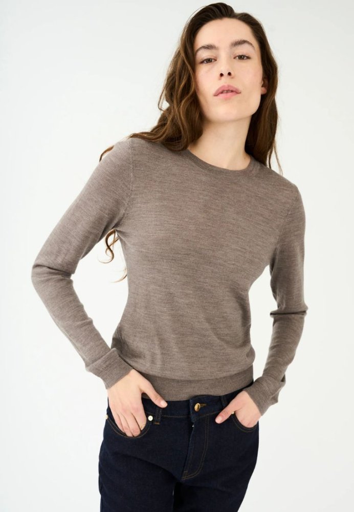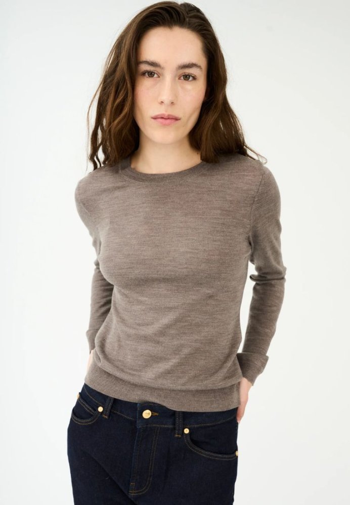Essex-strikken fra IVY Copenhagen i farven Brown Melange er en let, blød og luksuriøs strik i 100% merinould. Med sin klassiske rund hals og rene snit passer den perfekt ind i enhver garderobe – både som basistrøje eller under en blazer. Ribkanter ved ærmer og bund giver et enkelt, men gennemtænkt udtryk. Den regulære pasform gør den ideel til både hverdag og kontor.