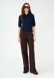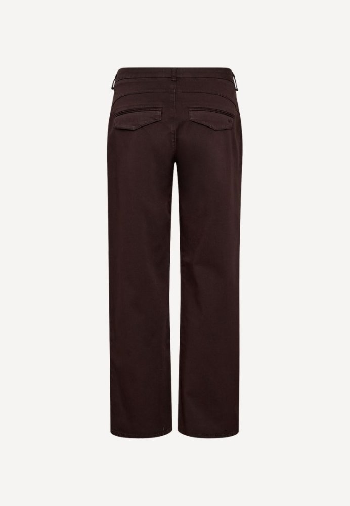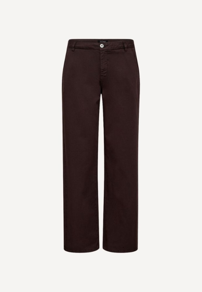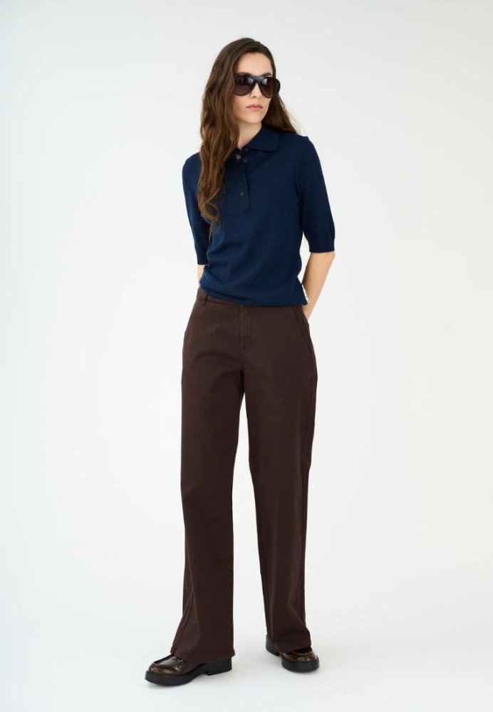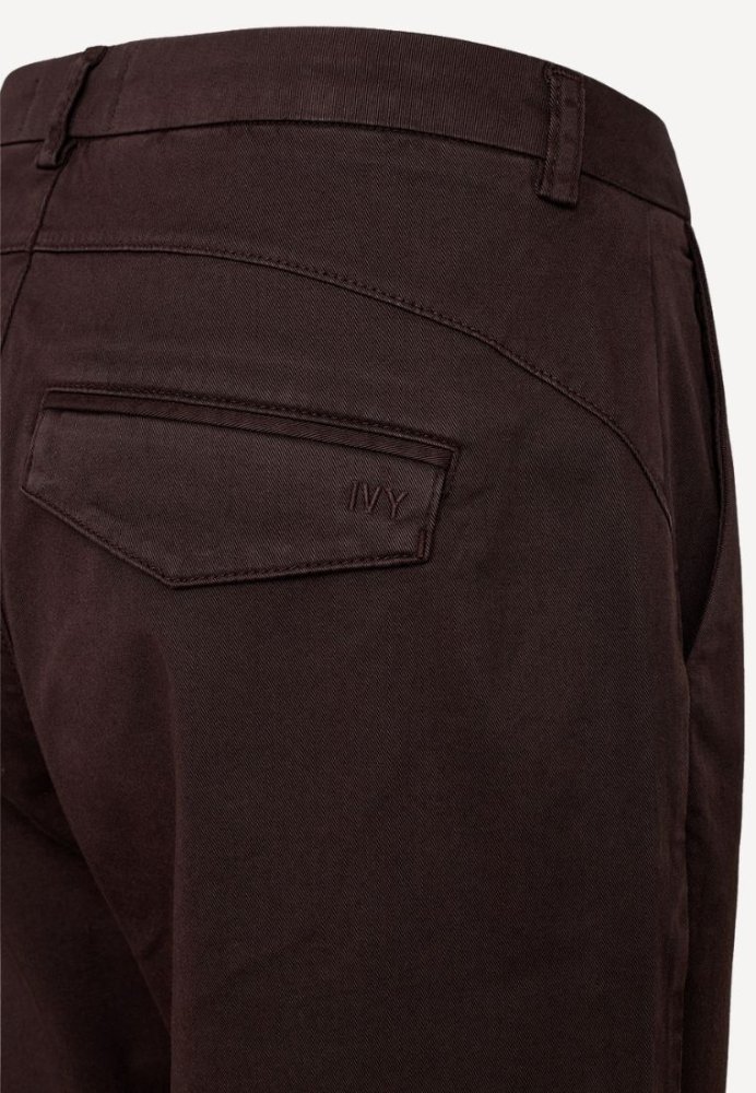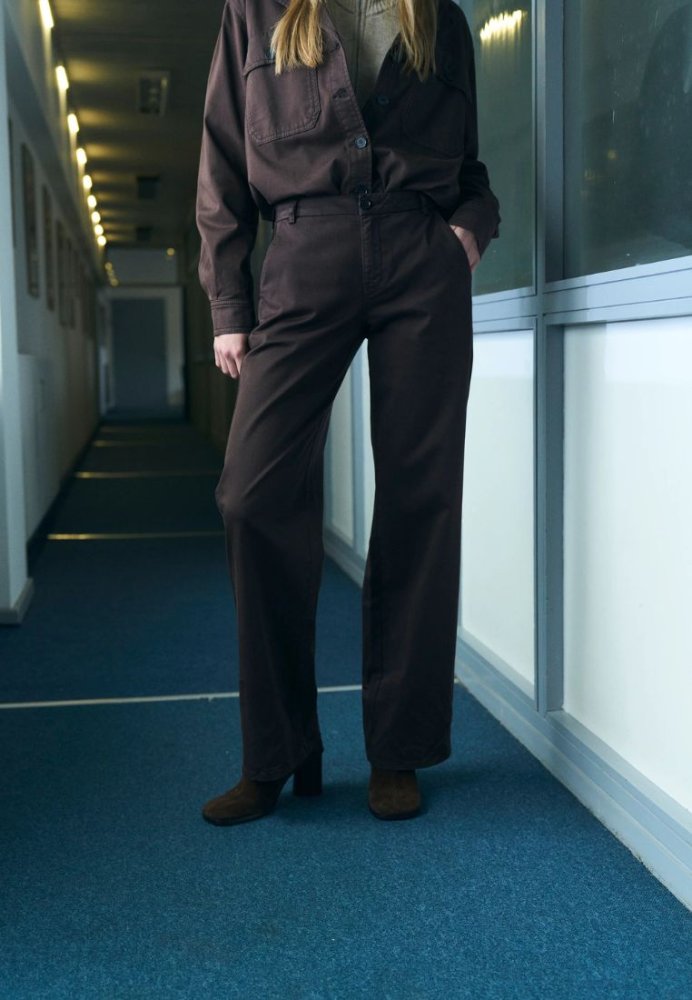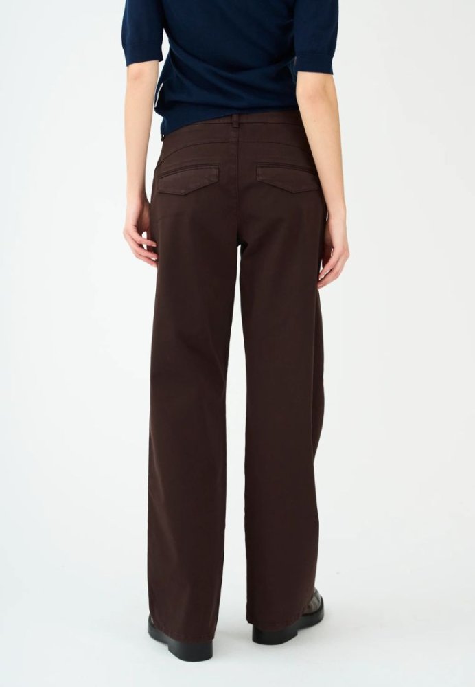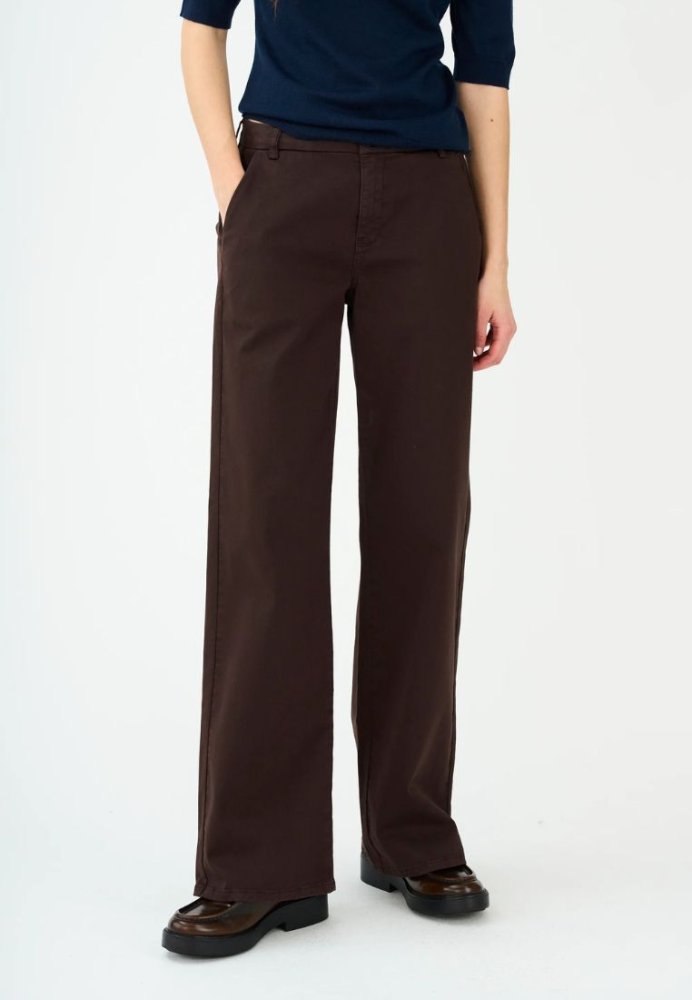 Karmey-bukserne fra IVY Copenhagen kombinerer klassisk chino-look med en moderne, bred benvidde, der giver både komfort og stil. Bukserne er fremstillet i en blød bomuldsblanding med lidt stræk, så de falder flot og er behagelige at have på hele dagen. Den dybe espressobrune farve giver et elegant og alsidigt udtryk – nem at style til både hverdag og kontor.