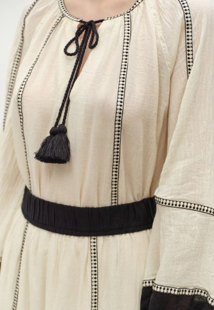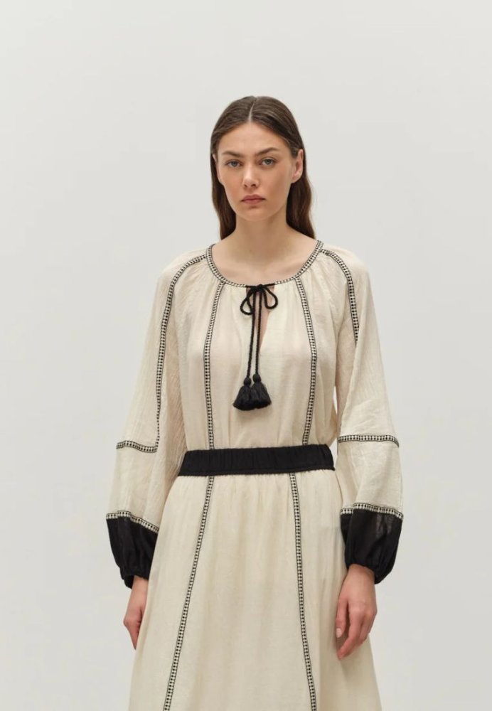 Super smuk top fra Devotion Twins i en let bomuldskvalitet. Toppen har rund halsudskæring, lange ballonærmer og fine sorte detaljer, der skaber et elegant og afslappet udtryk. Perfekt til både jeans, nederdele eller over en sommerkjole. En luftig og alsidig top, som du uden tvivl vil blive glad for.