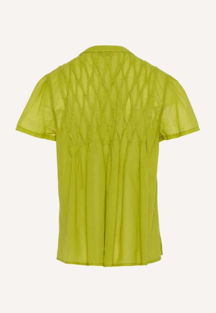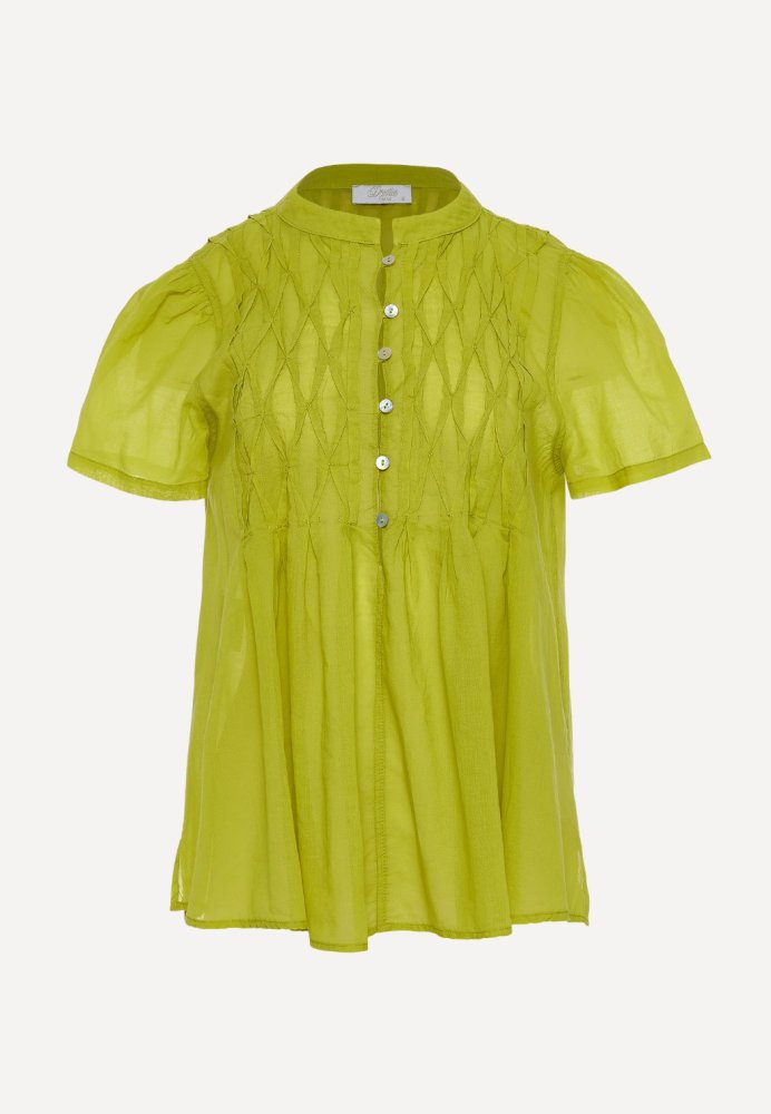 Blusen har en løs og behagelig pasform med korte ærmer og en feminin stolpelukning med fine knapper foran. De dekorative lægdetaljer over bryst og ryg skaber struktur og et raffineret spil i stoffet, som understreger den eksklusive finish.
