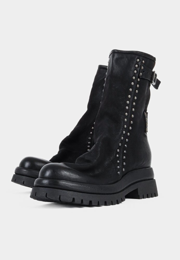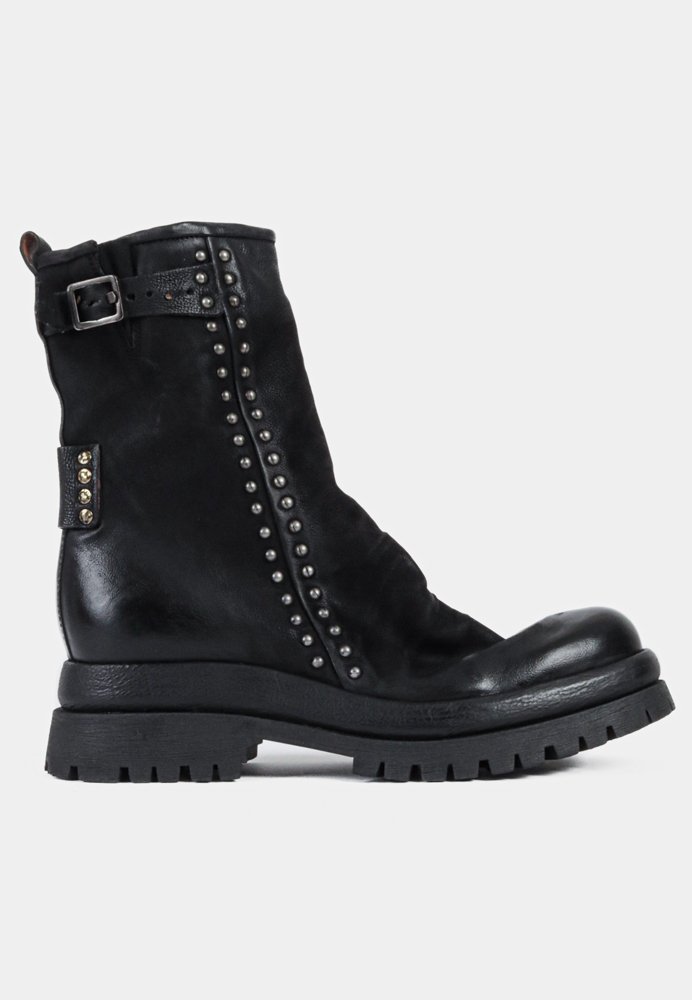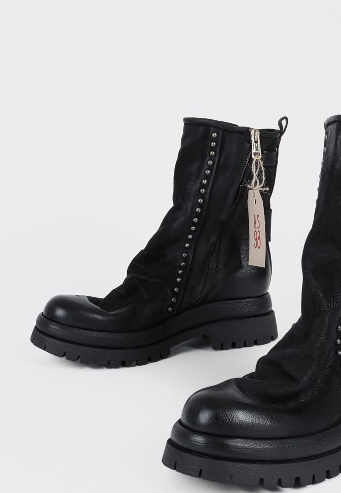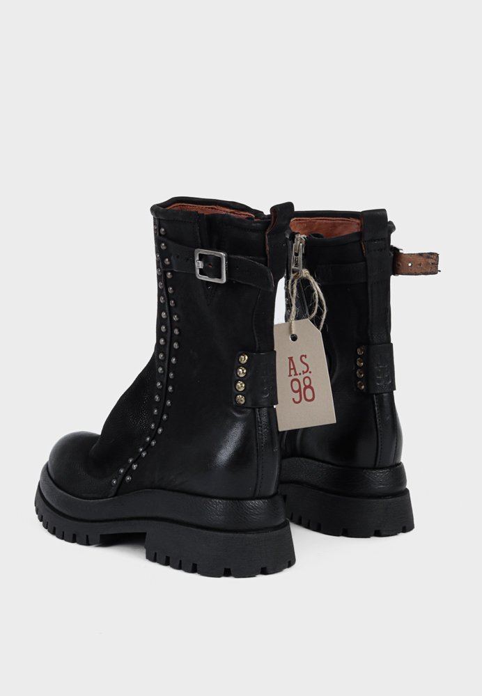 Giv din garderobe et nyt twist med disse sorte læderstøvler fra A.S. 98. De markante sølvnitter langs skaftet og den justerbare spænde ved anklen tilføjer kant og attitude, mens den robuste sål sikrer både komfort og holdbarhed. Med deres unikke detaljer er disse støvler perfekte til dig, der ønsker at skabe et iøjnefaldende look uden at gå på kompromis med hverken stil eller funktionalitet.
