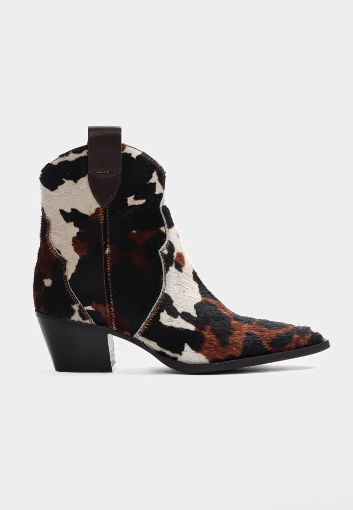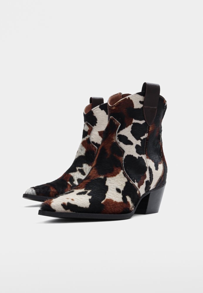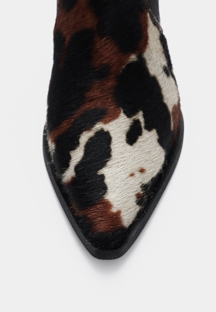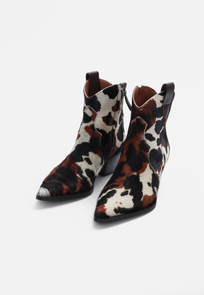 Cool og trendy western støvle fra danske BUKELA i det sejeste ko-print. Støvlen er et modebevidst valg til dig, der tør at skille sig ud i mængden. Ina støvlen er oplagt til din garderobe, hvor den giver et cool twist og kan styles til både kjoler eller jeans.