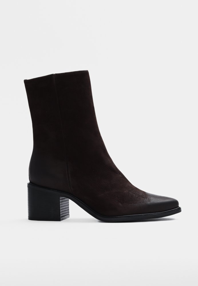 GINA er en høj støvle i mørkebrunt, italiensk nubucklæder med en blød, mat overflade og en flot struktur, som kun bliver smukkere med tiden. Den robuste gummisål giver et solidt greb og komfort hele dagen, mens det læderforede indre sikrer åndbarhed og en behagelig pasform. GINA kombinerer et råt og tidløst look, der passer perfekt til både hverdag og weekend – et must-have til støvlesamlingen.