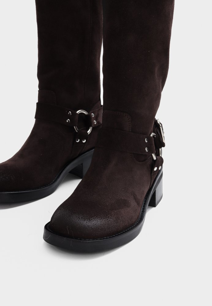 Opdag den perfekte kombination af moderne stil og komfort med denne knælange støvle fra Bukela. Støvlen er fremstillet i blødt, dybt mørkebrunt ruskind, som giver et eksklusivt og tidløst udtryk. En alsidig favorit, der passer til både kjoler, strik og bukser.