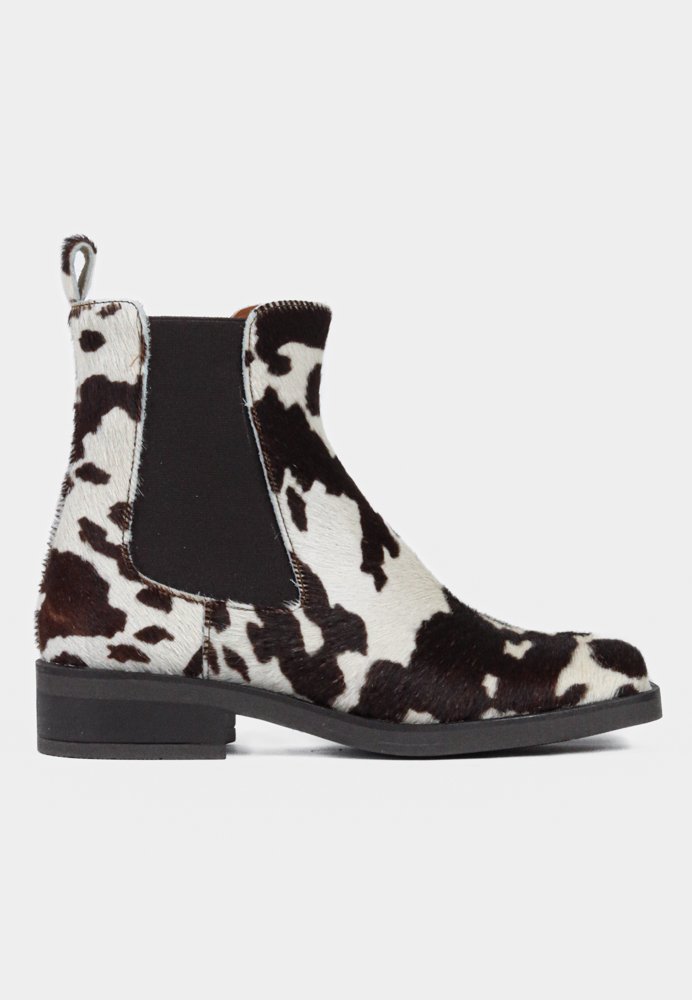 Statement-ankelstøvle i ægte læder med iøjnefaldende cow-print, der tilfører dit outfit kant og personlighed. Den klassiske Chelsea-silhuet med elastiske sider gør støvlen nem at tage af og på, mens den solide sål og lave hæl sikrer komfort hele dagen. Perfekt til både jeans, kjoler og lag-på-lag looks.