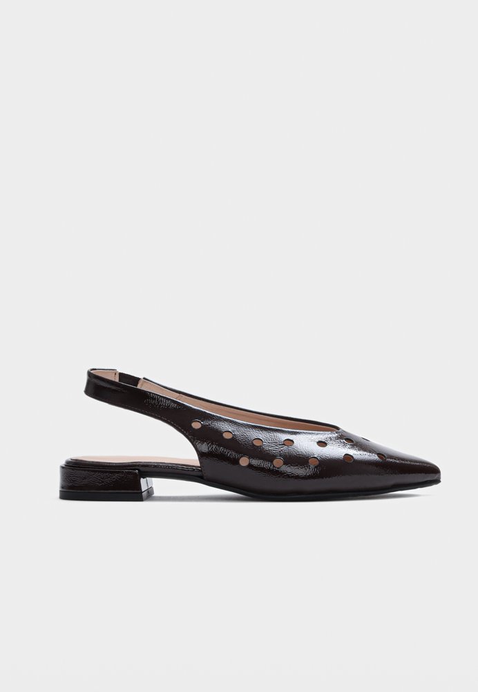 Cara er en feminin slingback med et elegant twist. Den blanke overflade og de fine perforerede detaljer giver skoen et let og luftigt udtryk, mens den dybe chokolade-farve tilfører varme og dybde. Den åbne hæl og lave blokhæl gør den ideel til både lange dage og hyggelige aftener.
