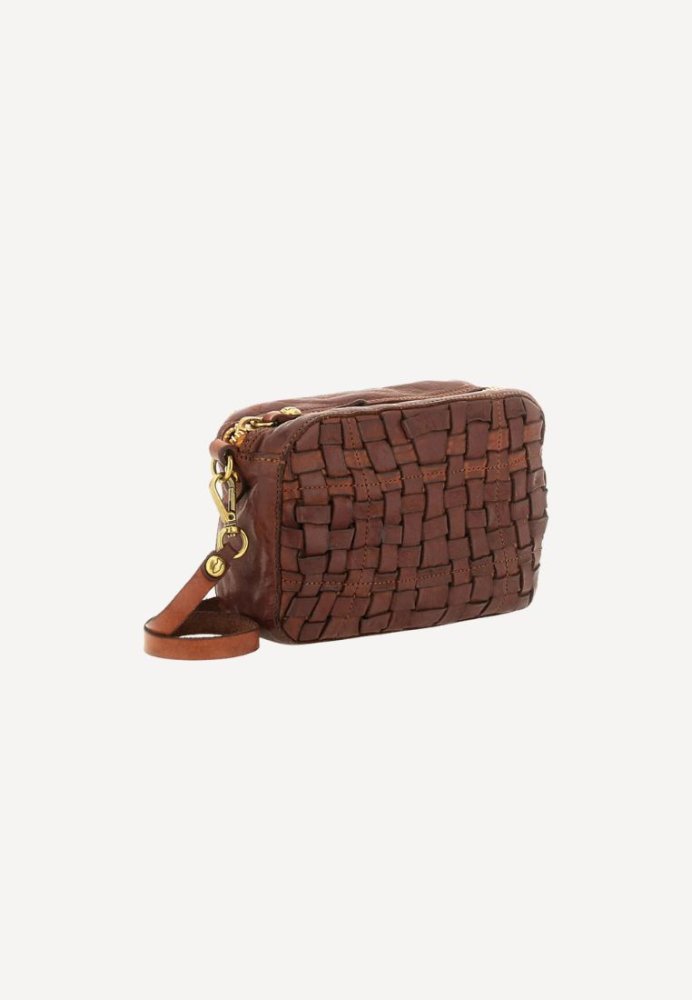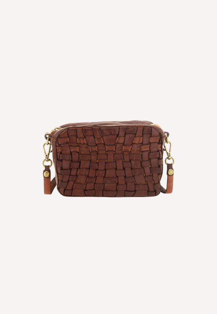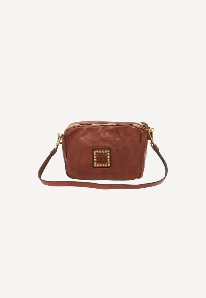 Oplev den elegante skuldertaske fra Campomaggi, håndlavet i cognacfarvet koskind med dekorative nitter. Denne italienske taske kombinerer traditionelt håndværk med moderne design, hvilket gør den til et tidløst tilbehør i din garderobe.