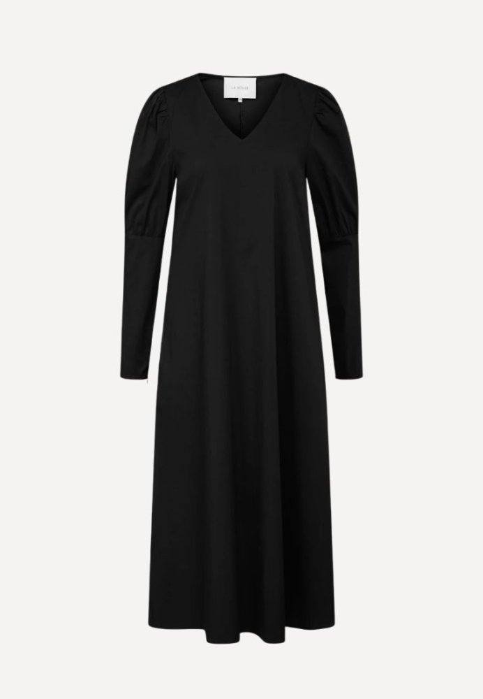 Brun kjole med lange ærmer og V-udskæring. Enkel A-formet silhuet med let puffede skuldre, der giver et stilrent og elegant look.