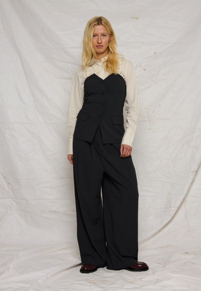 Trine bukser fra La Rouge er et par elegante og komfortable bukser i en smuk mørkegrå nuance. De er fremstillet i en blød og let stretchy kvalitet, der giver dig både bevægelsesfrihed og stil. Pasformen er afslappet og flatterende – perfekt til både hverdagsbrug og mere formelle sammenhænge. Kombinér dem med en skjorte eller blazer for et klassisk look, eller med en strik for en afslappet stil.