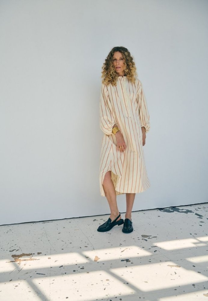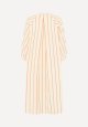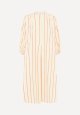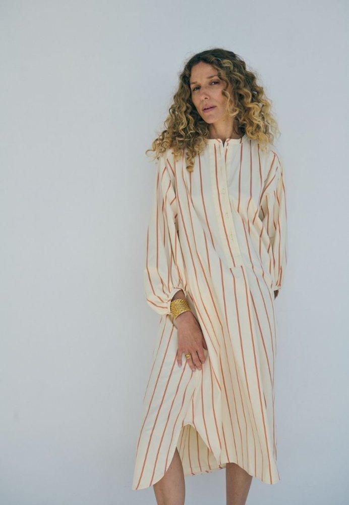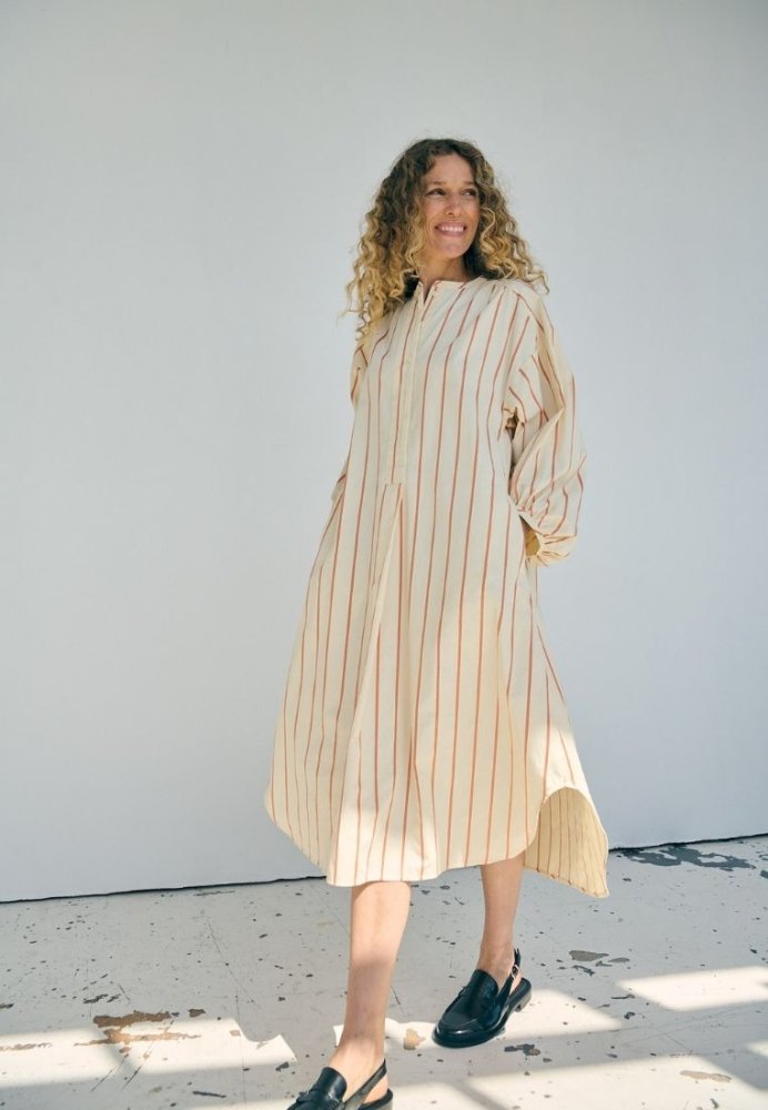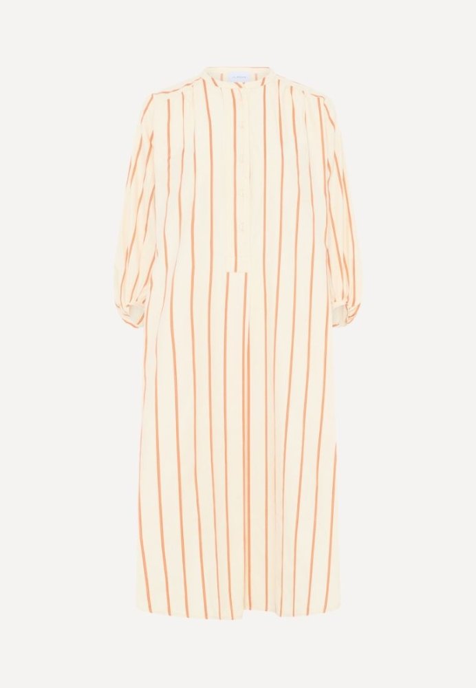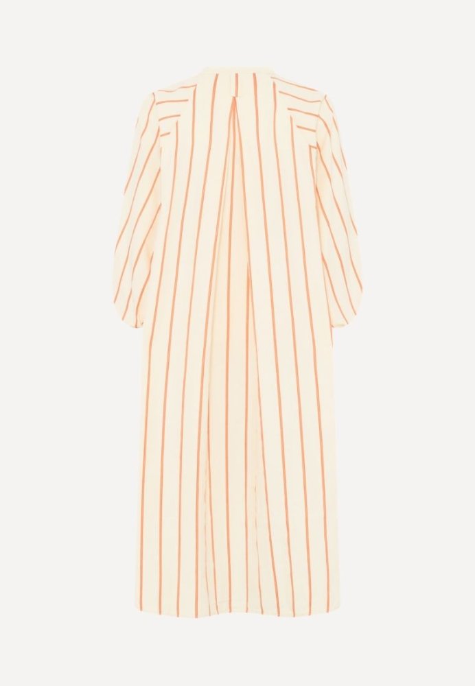 Louise kjole er en let og elegant kjole med et livligt twist takket være de fine orange striber. Den runde hals og knaplukning giver et sofistikeret touch, mens de 3/4 lange ballonærmer tilfører bevægelse og blødhed til silhuetten. Kjolen falder smukt omkring kroppen med en løs og behagelig pasform, perfekt til både hverdagsbrug og mere sammensatte outfits.