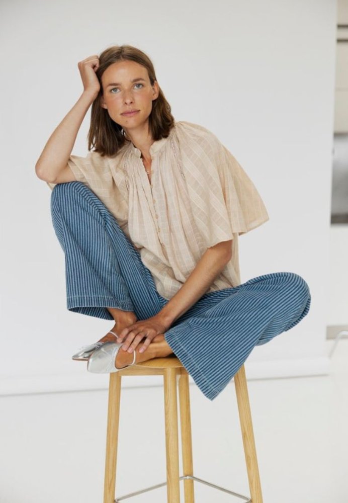 Sandie er en feminin kortærmet bluse med en a-formet silhuet og en løs pasform. De brede raglanærmer skaber et smigrende og elegant udtryk. Blusen er udsmykket med eksklusive, håndlavede blondedetaljer og håndbroderede bånd, som giver et unikt og sofistikeret look.