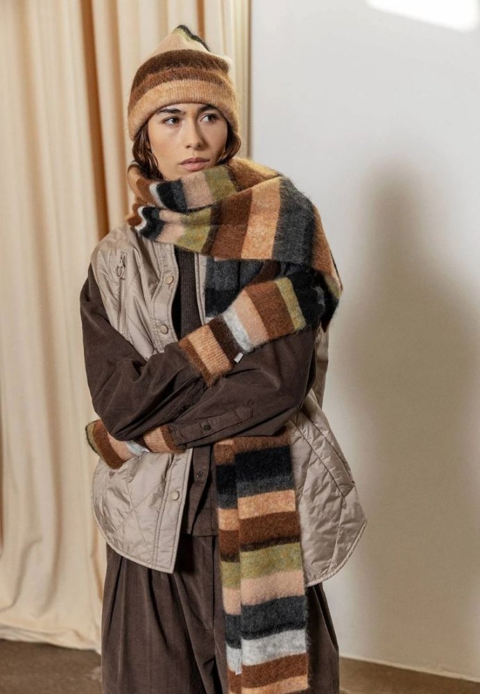 SCARF er et lækkert og blødt halstørklæde i en eksklusiv mohair-stribe kvalitet. Fremstillet af en luksuriøs blanding bestående af 33% super kid mohair, 33% uld, 26% polyamid og 6% spandex, som sikrer både varme og komfort. Det farverige design i flere nuancer gør tørklædet til et stilfuldt og alsidigt accessory, der passer perfekt til efterårs- og vintergarderoben.