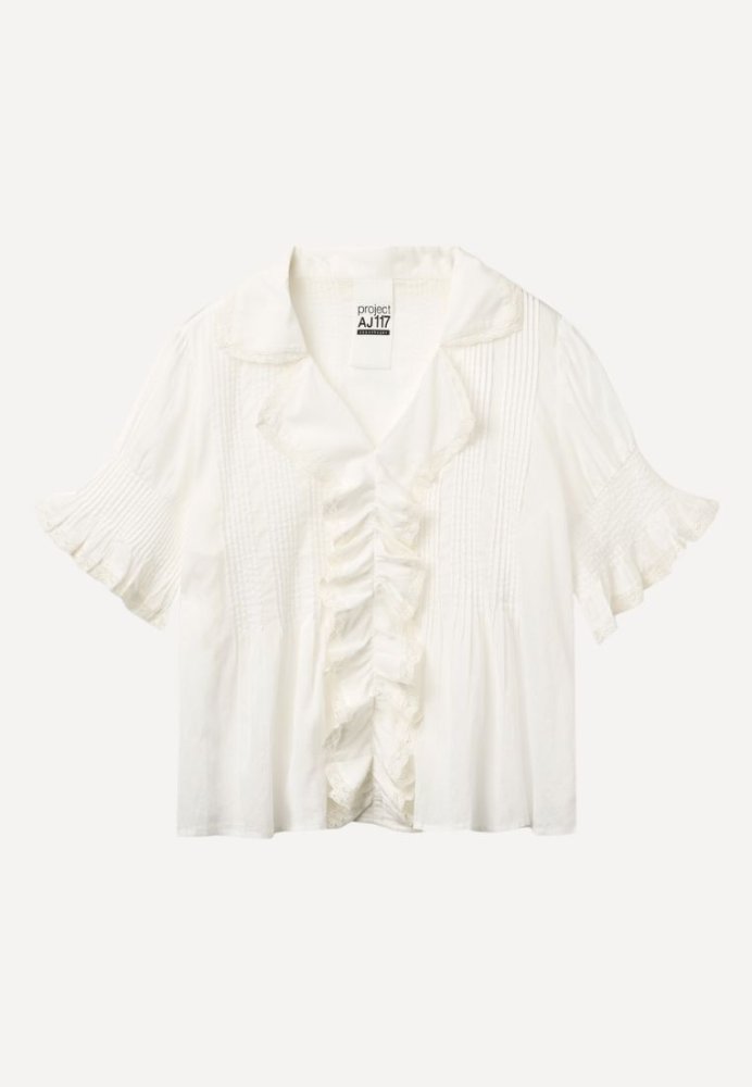 Bluse fra Project AJ117 i 100% let voile bomuld med et elegant, feminint udtryk. De fine flæsedetaljer og den bløde struktur giver et luksuriøst look, der både kan styles afslappet og mere dressed-up. En smuk og let favorit til sæsonen.