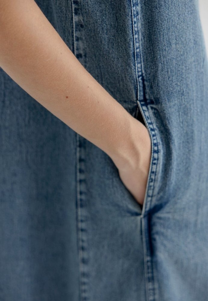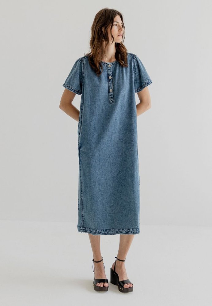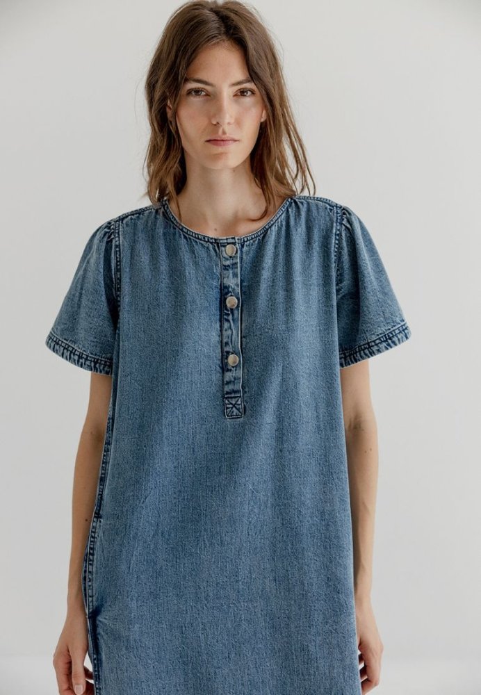 Kjole fra Project AJ117 i 100% bomuld med et afslappet denimlook. De korte ærmer, knapdetaljen og det lige snit giver en cool, ubesværet stil, perfekt til hverdagsbrug. Let, komfortabel og nem at style året rundt.
