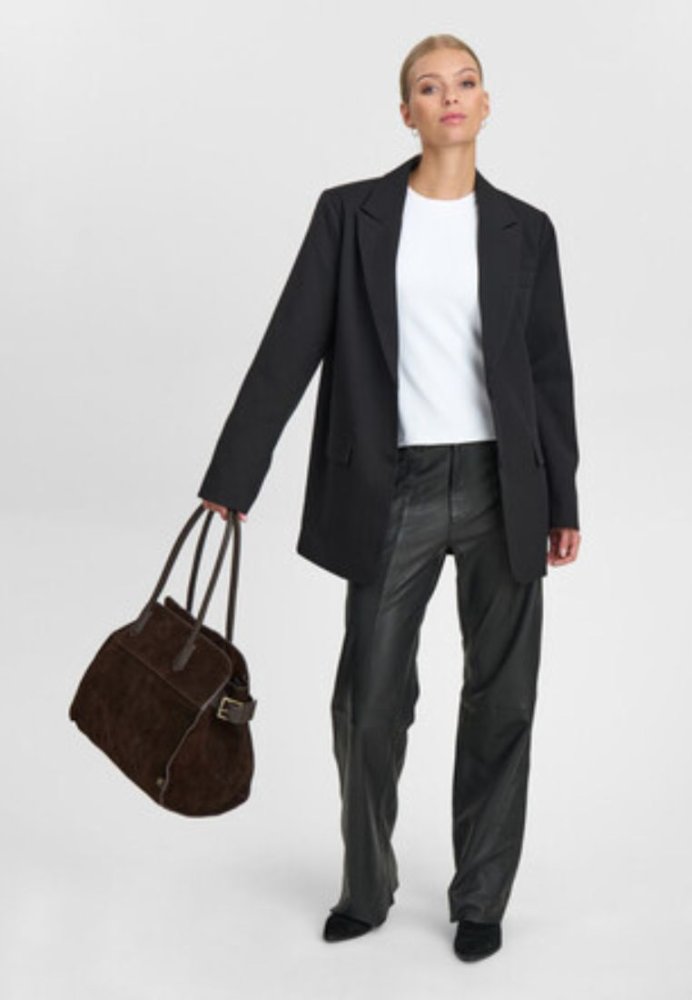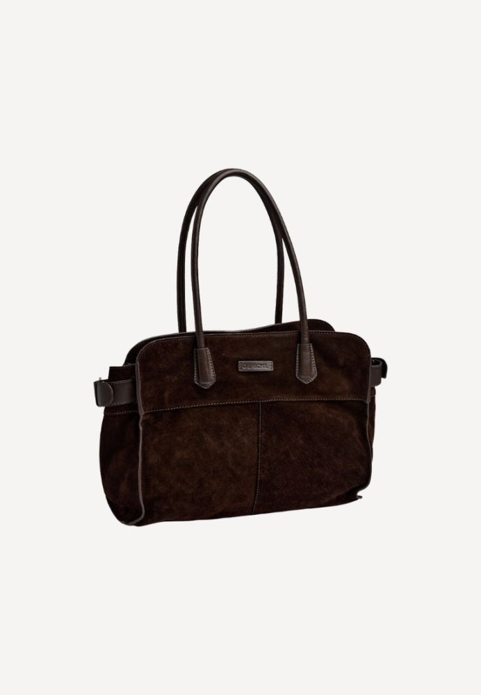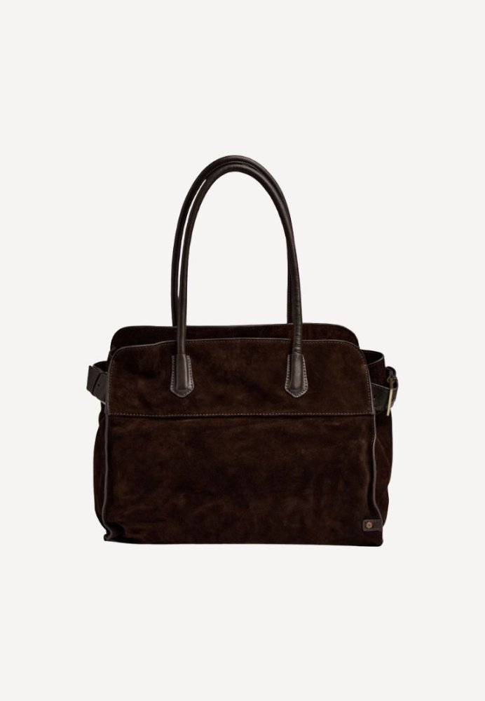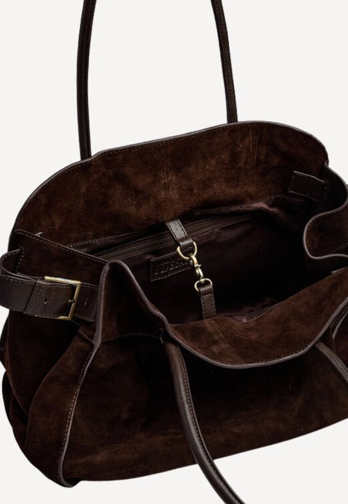Chokoladebrun ruskindsshopper med minimalistisk design og håndtag i matchende læder – stilren og elegant i blødt ruskind.