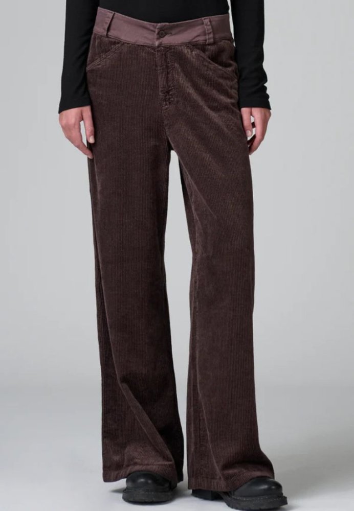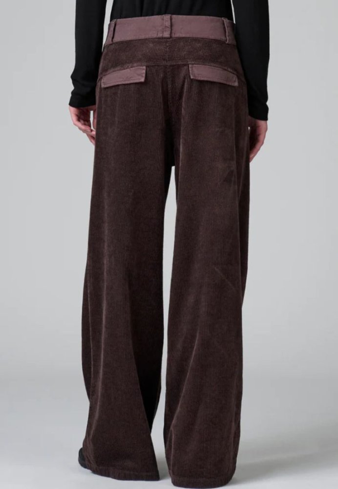 Wide leg-bukser i strækbar bomulds- og viskosecord, med diagonale lommer og en elegant bæltestrop med flaps.