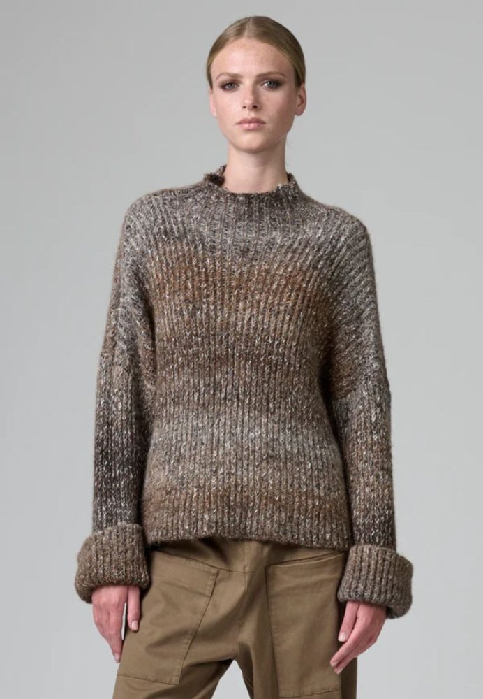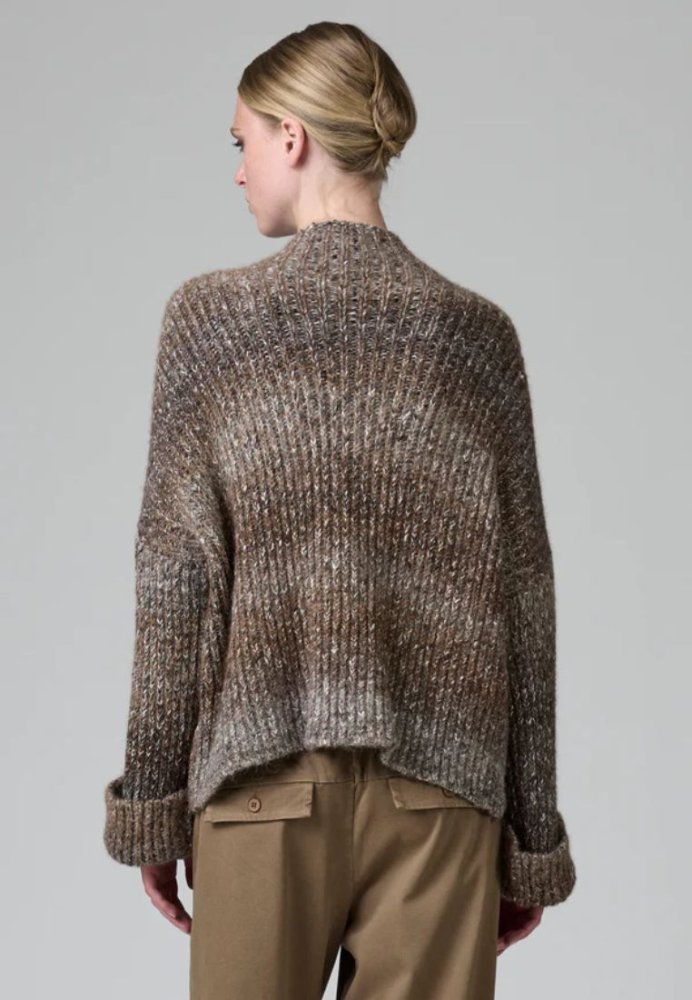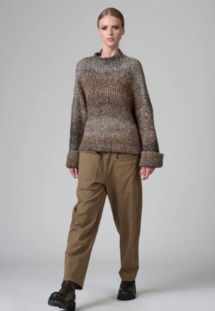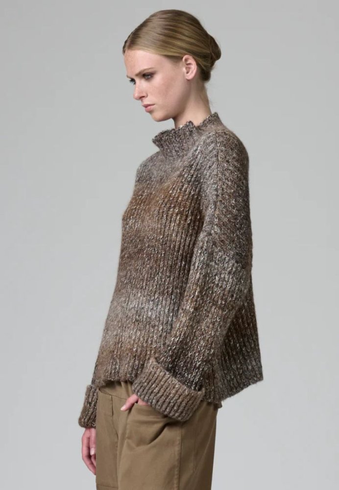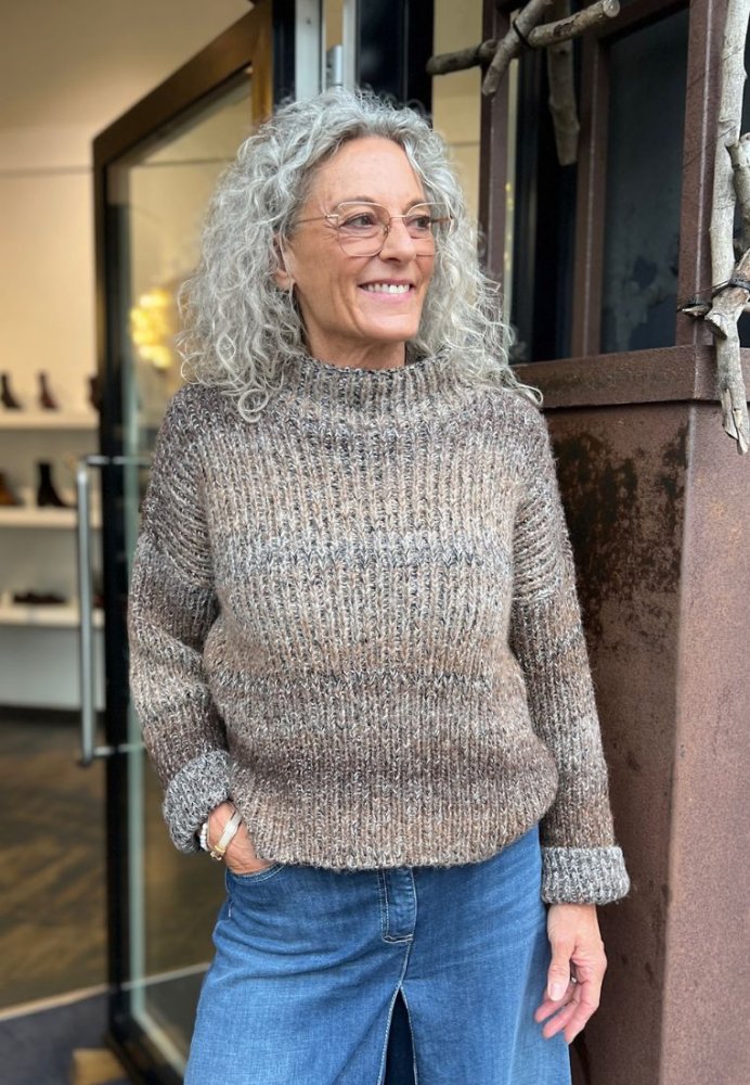 Strik med rullekrave og nedfaldende ærmer i en smuk blanding af alpaca og netfarvede striber. Den bløde, lette kvalitet sikrer en behagelig pasform, mens det elegante snit gør den velegnet til både hverdag og mere formelle looks. Med sin afdæmpede farvepalet passer den smukt til både neutrale og mere farverige outfits.