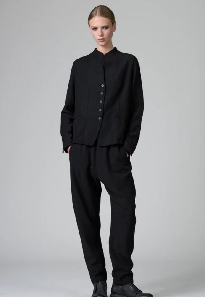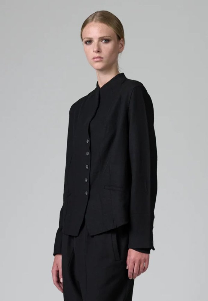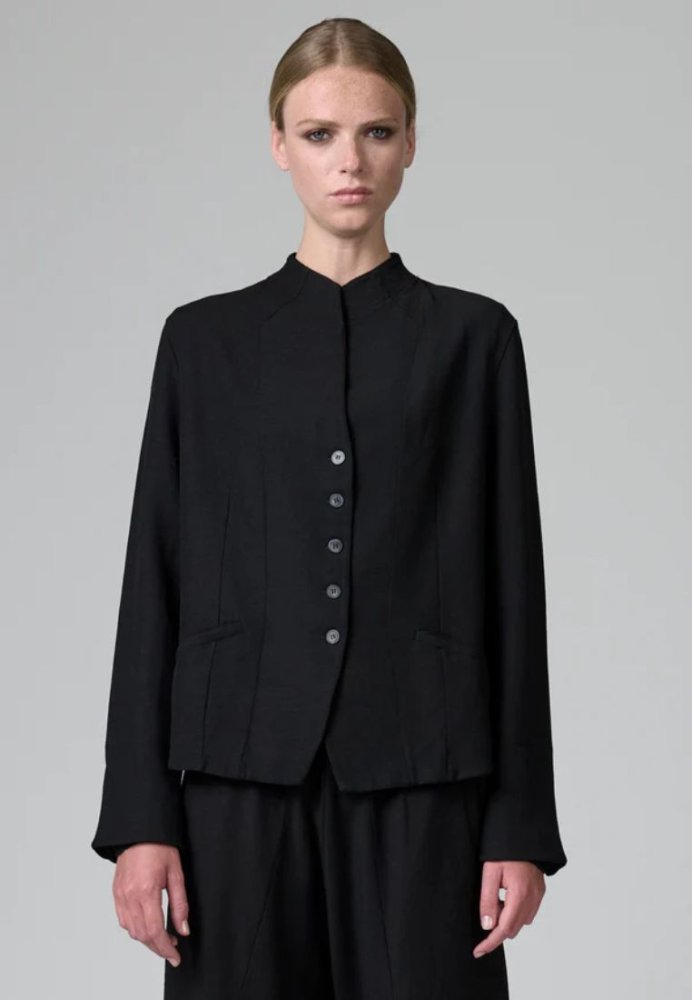 Stretch jakke fra Transit i mørk farve med American-krave, 5-knaps lukning, diagonale lommer og korte slids ved manchetter – foret for ekstra komfort.