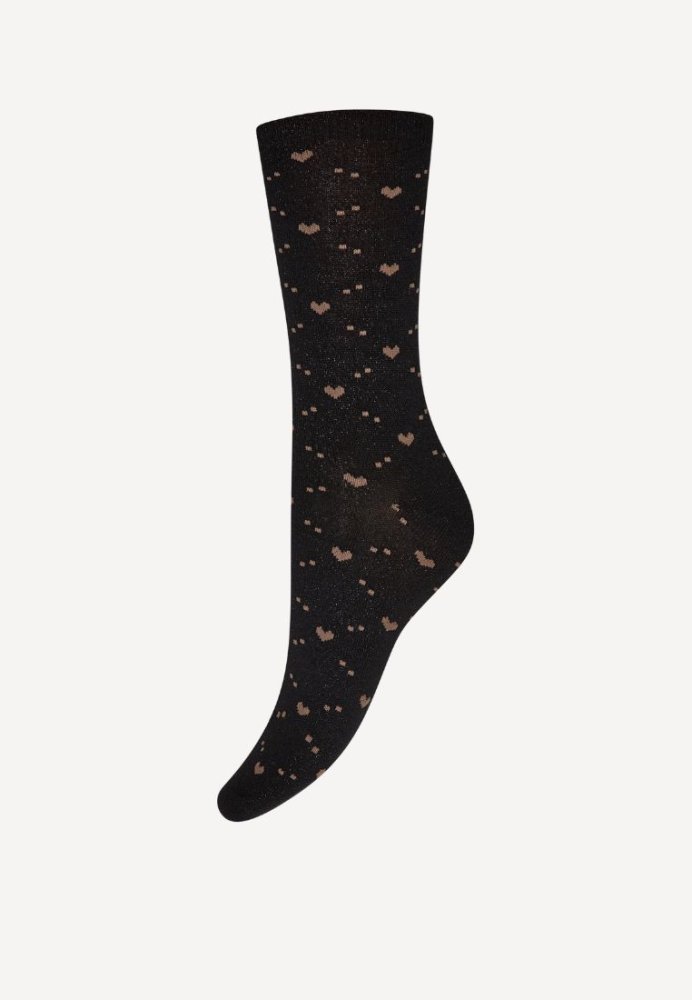 HTD-strømpen med indvævet lurextråd er en elegant onesize-strømpe (str. 37–41), der tilføjer glimmer til dit outfit med cool hjerter. Den bløde og strækbare blanding af viskose, polyamid, polyester og elastan sikrer en behagelig pasform og gør strømpen ideel til både hverdag og festlige anledninger.