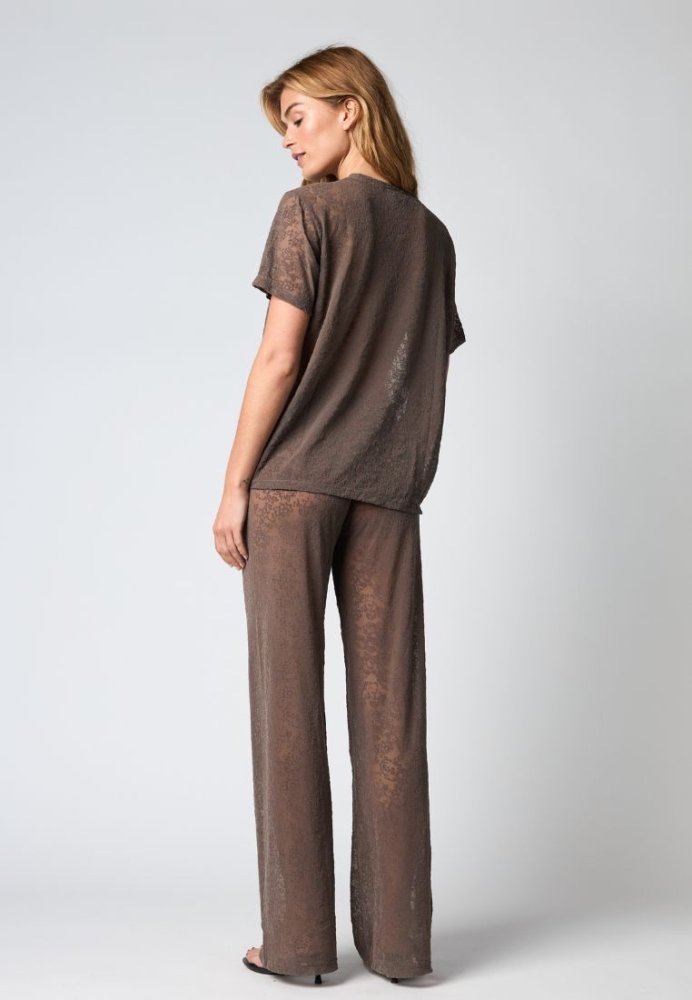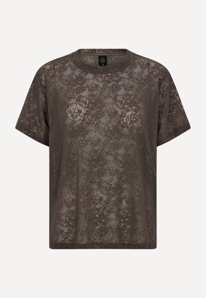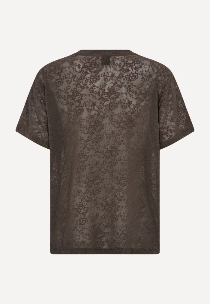 Let og feminin bluse fra Hype The Detail i varme brunlige nuancer med et elegant floralt mesh-design. Blusen er designet med rund hals, korte ærmer og en afslappet pasform, der giver et moderne og luftigt udtryk. Perfekt til lag-på-lag styling ? brug den over en top for et stilfuldt look.