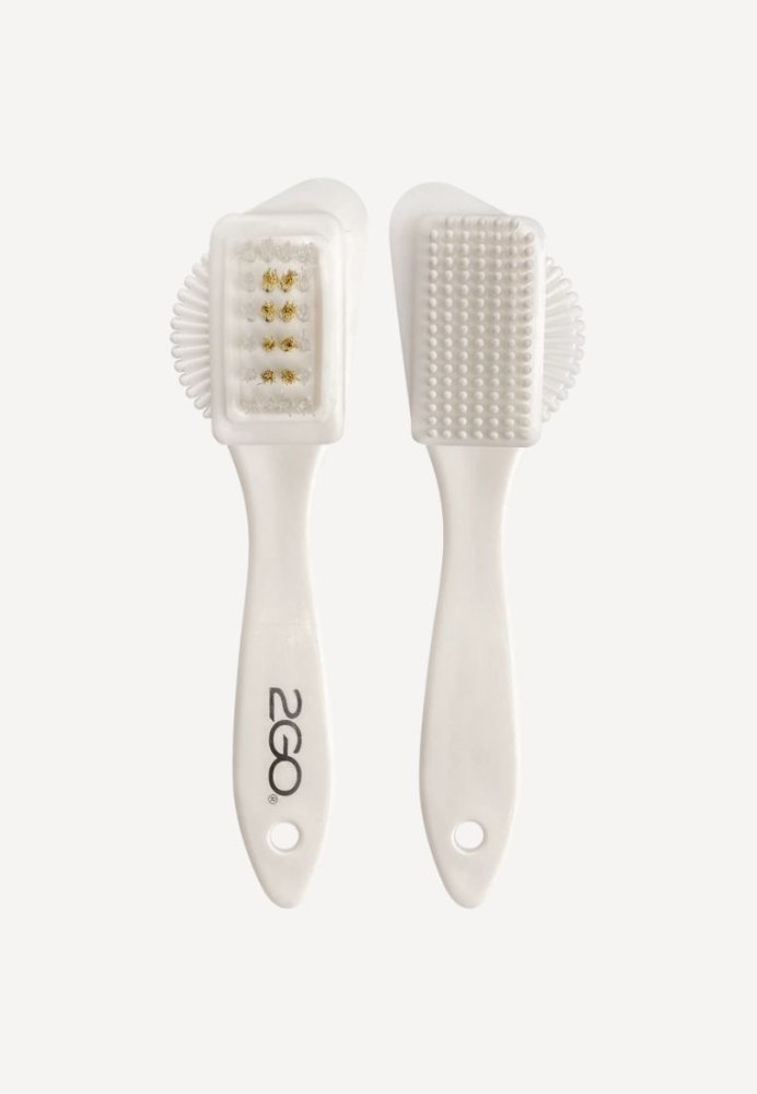 Ruskindsbørste med messing til rengøring af ruskind og nubuck. Gummibørste på den ene side og messing og nylonbørste på den anden side.