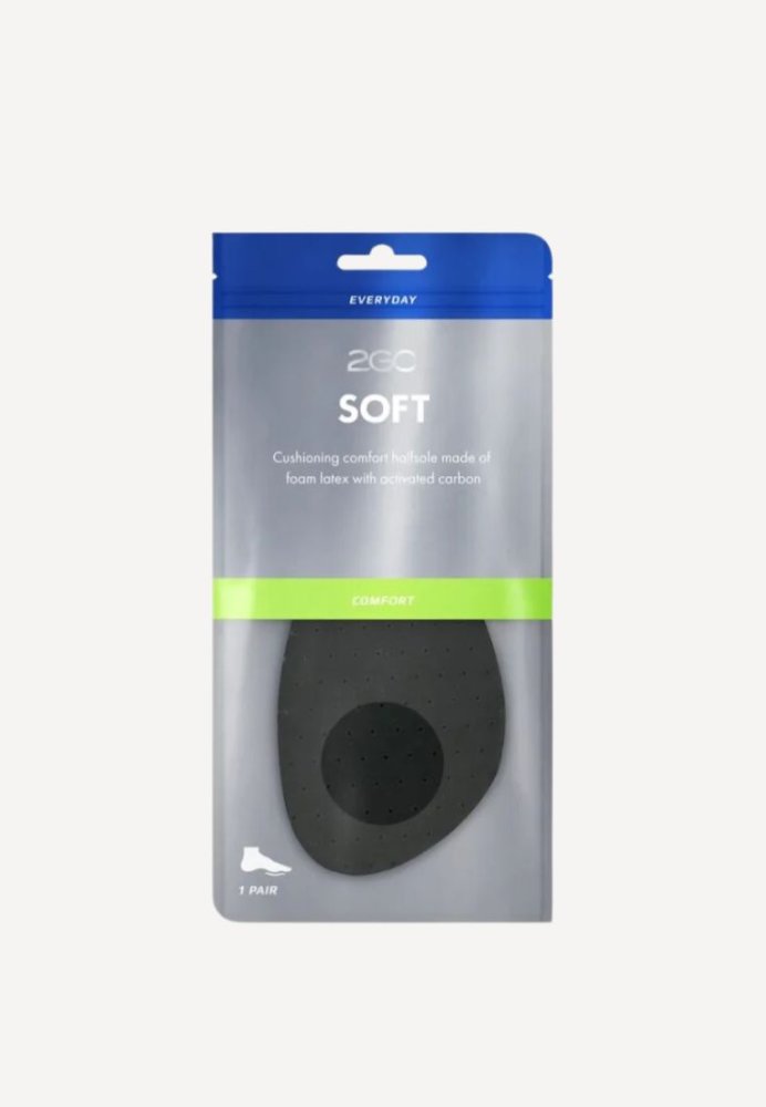 Super blød halvsål fra 2GO. Sålen er med overside af absorberende viskose og underside af latexskum for optimal støddæmpning. Halvsålen er perforeret for en mere effektiv luftcirkulation og fugtabsorbering. Velegnet til de fleste helårssko, ideel til høje hæle.
