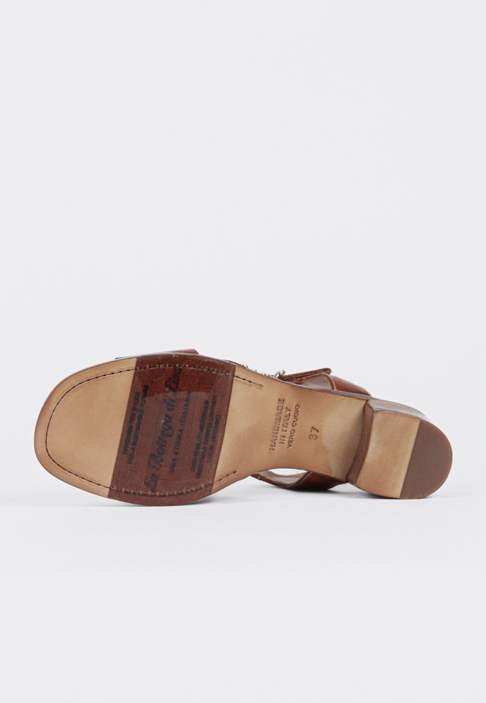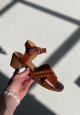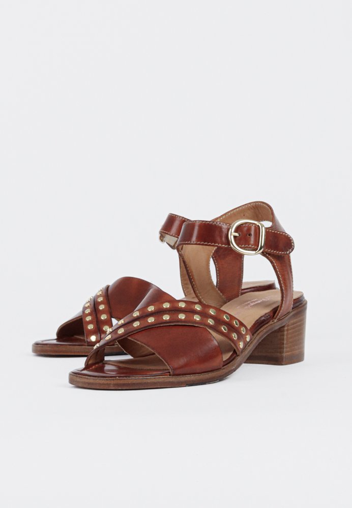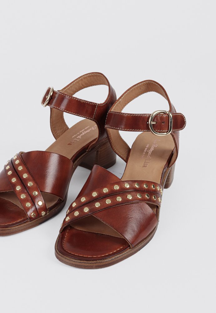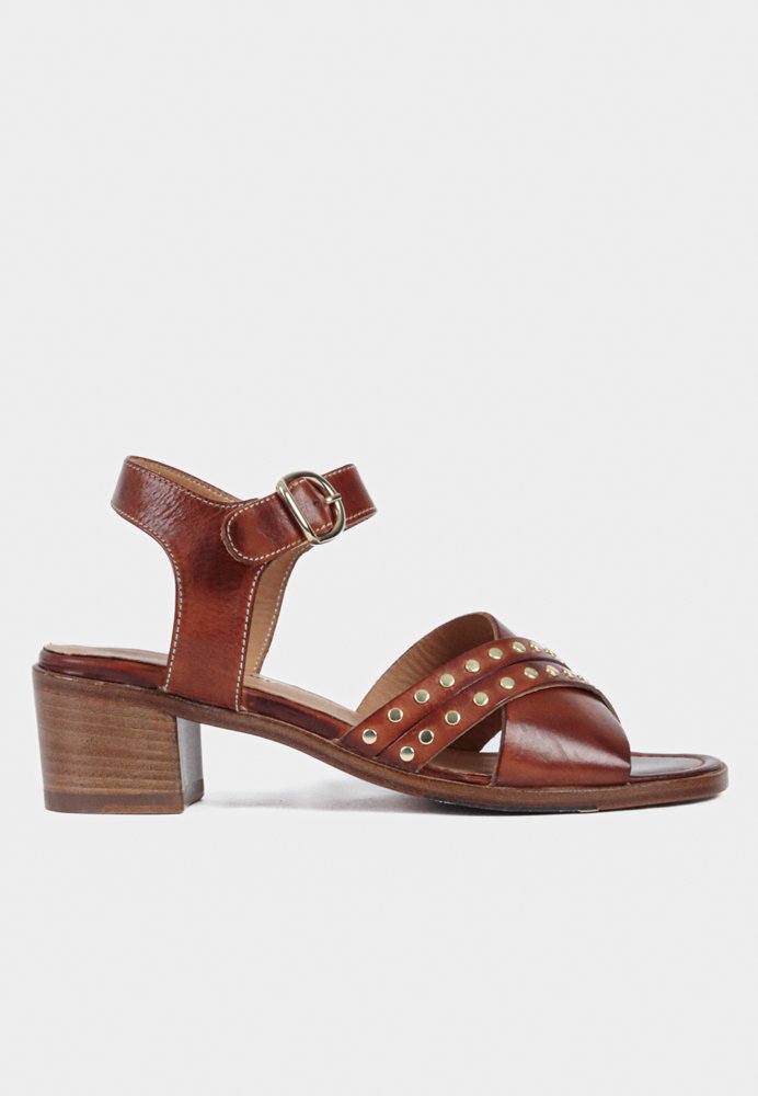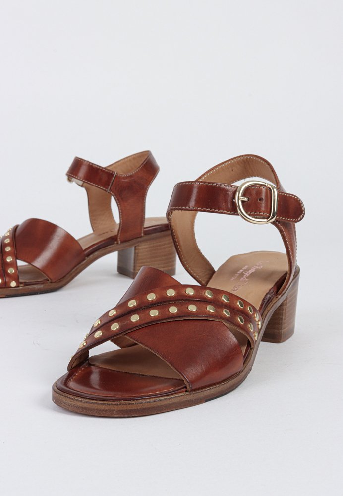 Denne cognacfarvede sandal i glat skind er både elegant og komfortabel. Med krydsede detaljer over vristen og guldspænde ved anklen, der kan tilpasses og har elastik på indersiden, får du både stil og funktionalitet. Den åbne for- og bagdel samt den 5 cm høje hæl skaber et sofistikeret og feminint look. Perfekt til både hverdag og fest.
