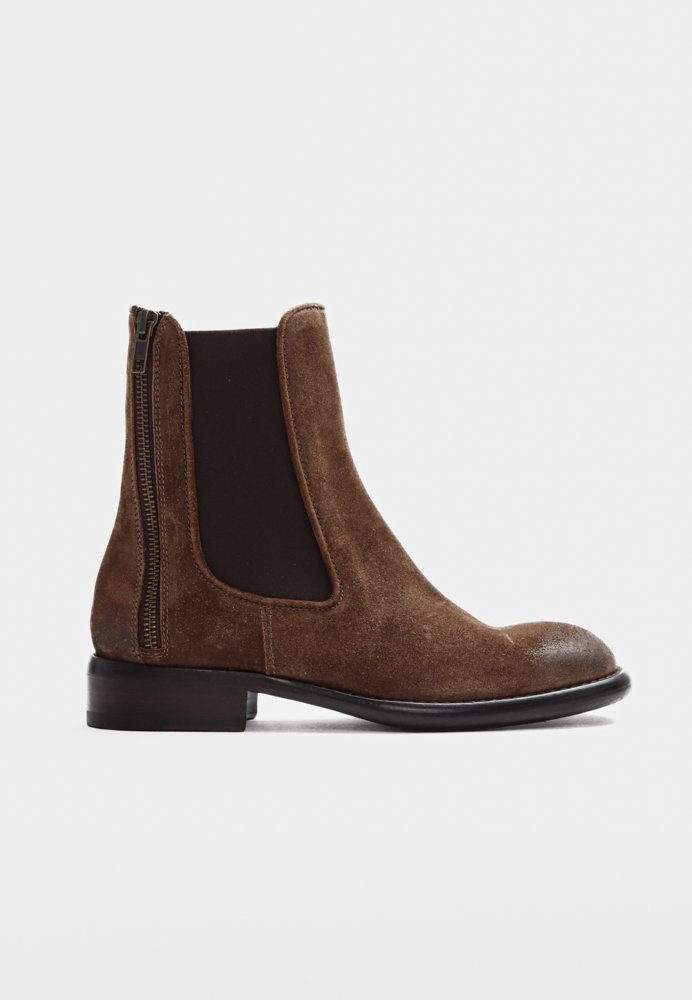 Eksklusiv italiensk elegance i brunt børstet ruskind. Denne støvle er designet med to lynlåse i hælen, og elastik i siderne, så den er udover at være nem at komme i, og utrolig komfortabel.