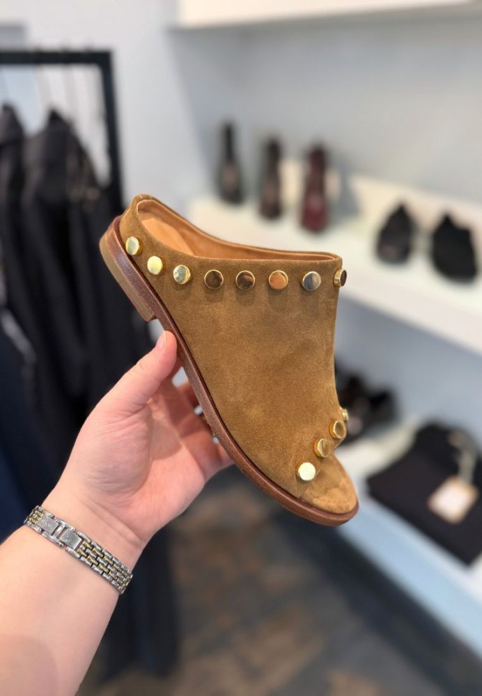 En moderne slip-in sandal fra La Bottega di Lisa i blødt ruskind med dekorative nitter, der giver et råt og elegant udtryk. Den åbne slip-on silhuet kombinerer komfort med et stilfuldt design, som gør modellen perfekt til både hverdagsbrug og sommerens afslappede looks.