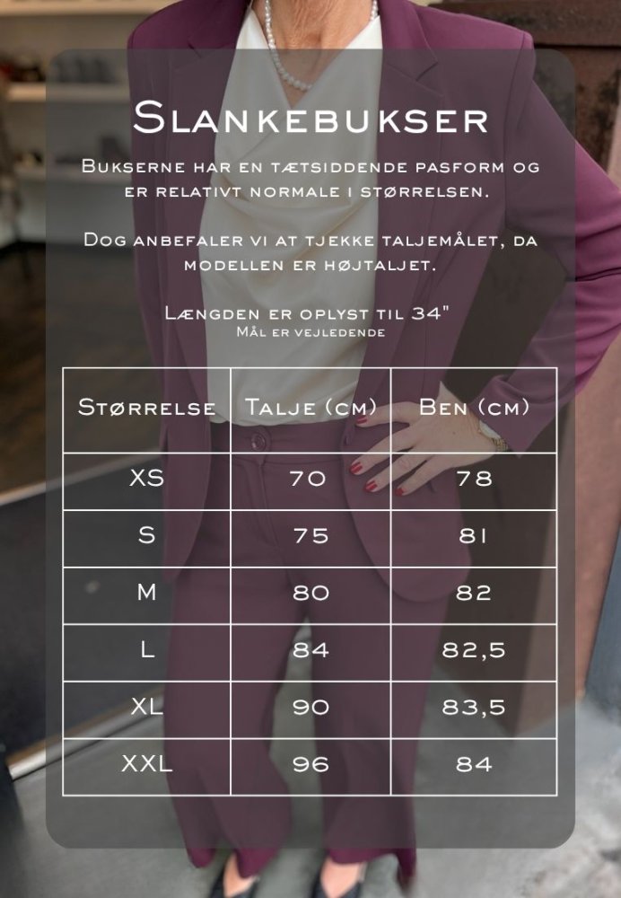 Slankebuksen er blevet en ægte favorit – og med god grund. Den har en smigrende pasform, der sidder tæt over talje og hofte og får benene til at syne lange og slanke. Materialet falder elegant langs kroppen, krøller minimalt efter vask og kræver hverken strygning eller dampning.