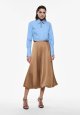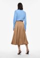 En knælængde nederdel, der indfanger bevægelsens elegance med sine flydende linjer og bløde læg. Skabt til dem, der ønsker at udtrykke deres personlighed, tilbyder denne nederdel en alsidig stil, der passer perfekt til enhver anledning. Tilføj et strejf af raffinement til din hverdagsgarderobe.