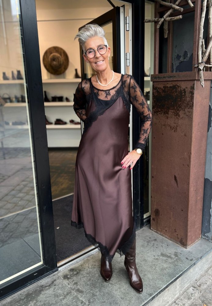 AFVTKBA kjolen fra Imperial i farven 1880 Moro (Mørkebrun) er en elegant og feminin model med et let, flydende fald med blondekant. Den er fremstillet i 100% polyester, hvilket giver en glat overflade og et smukt draperet udtryk. En alsidig kjole, der kan styles både til hverdag og fest – klassisk italiensk design med moderne kant.