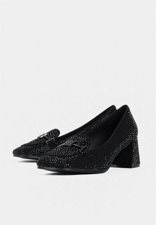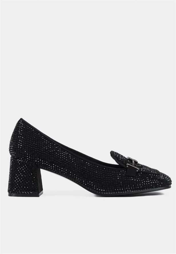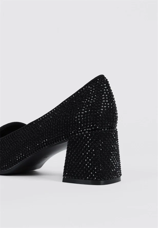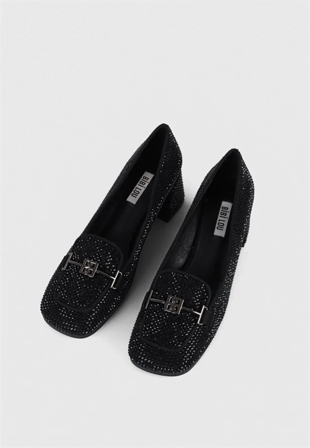 Utroligt elegante pumps fra det spanske mærke Bibi Lou. Disse sorte pumps er betrukket med sorte glitrende rhinsten, der fanger lyset fra alle vinkler, og har en sofistikeret metaldetalje, som tilføjer et ekstra strejf af glamour. Perfekte til at løfte ethvert outfit, fra et par jeans til en festkjole. Helt ideelle til festlige lejligheder eller hvis man ønsker at tilføje lidt glamour til hverdagen.