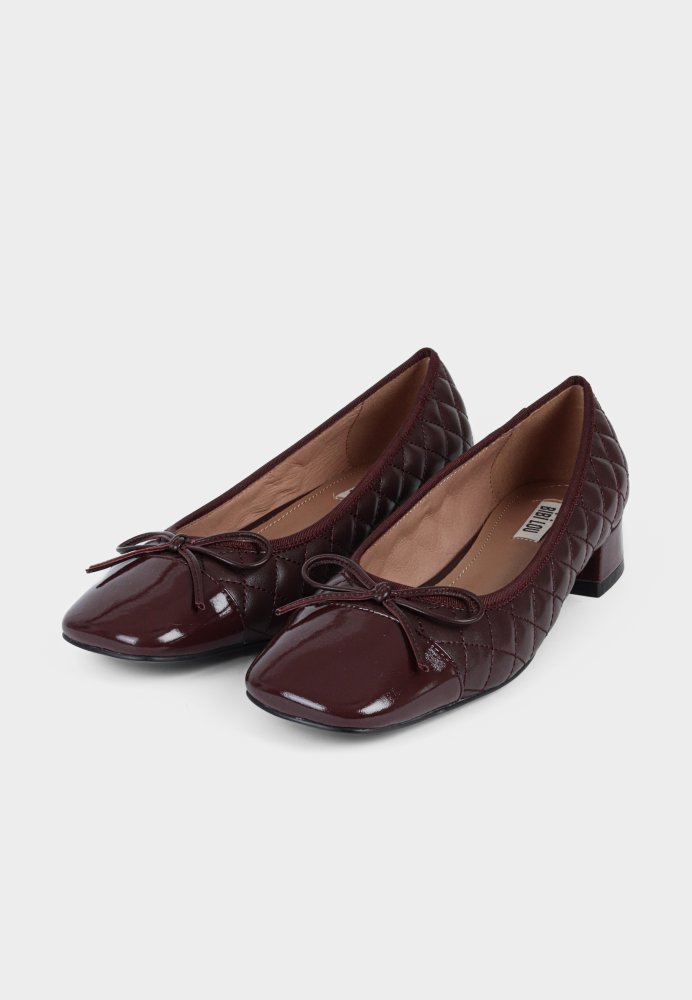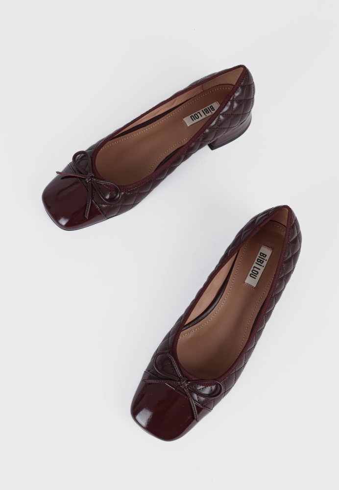 Den mest elegante burgundy ballerina fra Bibi Lou med smukt quiltet mønster og lakdetaljer. Skoen har en spids snude, en stilfuld sløjfe og en komfortabel indbygget hæl, der giver et subtilt løft. Perfekt til både hverdag og fest!