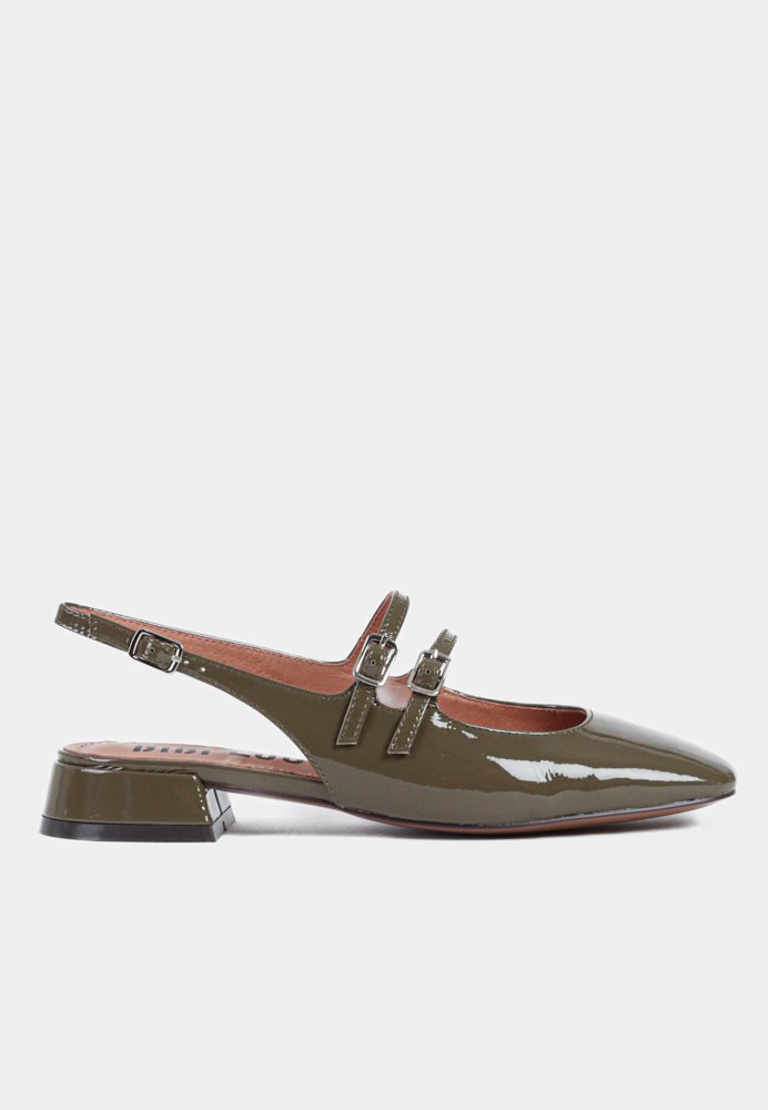 Khakigrønne pumps i læder med åben hæl og justerbar spændelukning bagtil. Hina slingback har en rund snude og to spænder over vristen, der giver et elegant og tidløst udtryk. Den 2,5 cm blokhæl sikrer komfort hele dagen, hvilket gør skoen ideel til både hverdag og fest.
