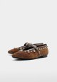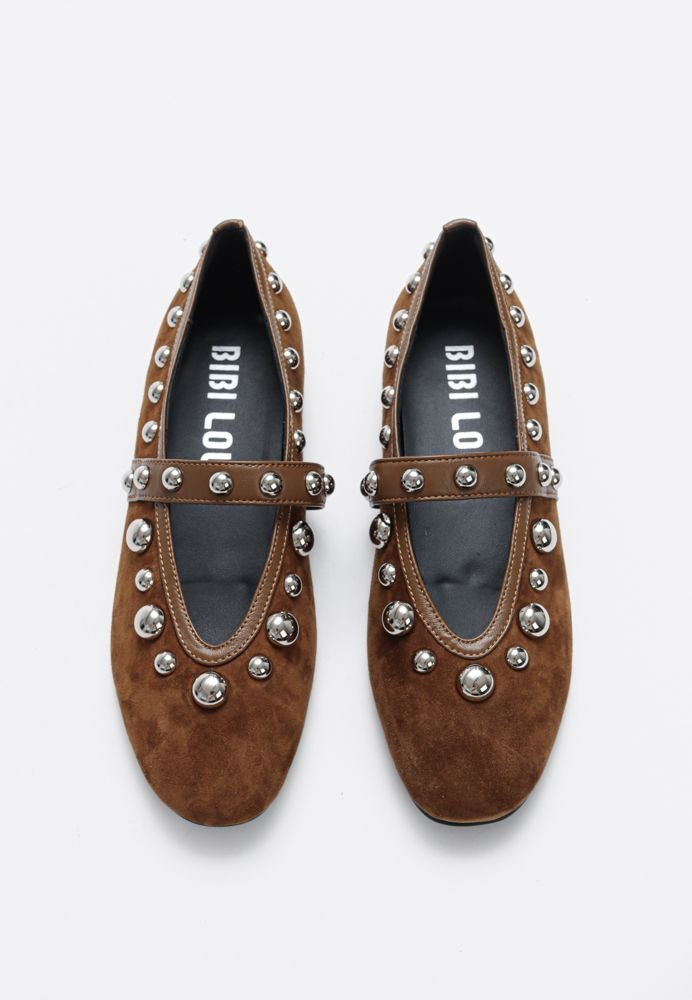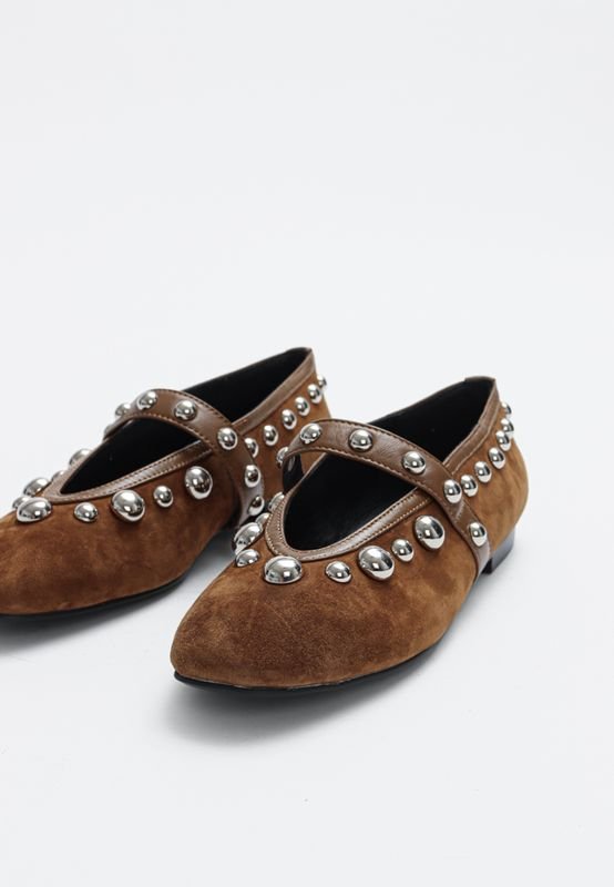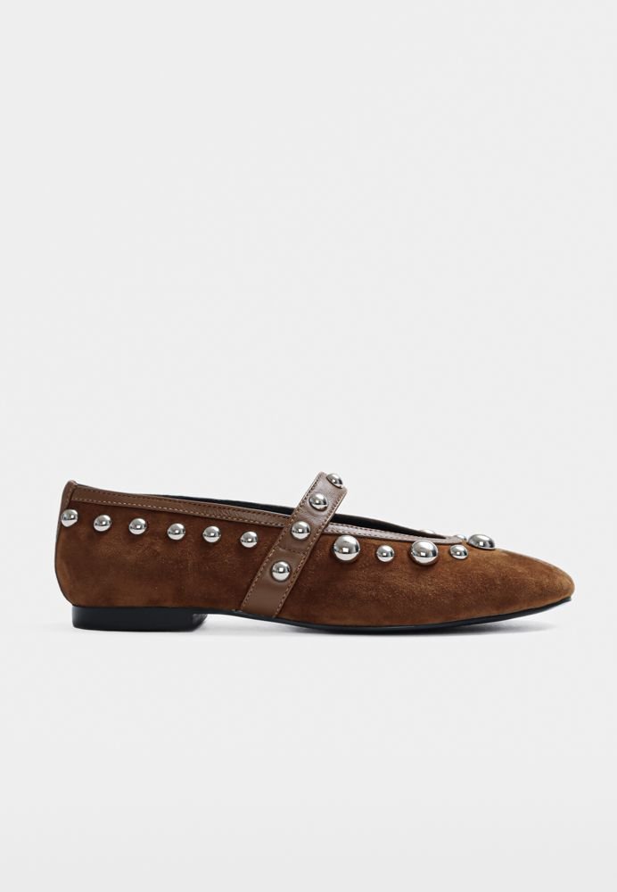 Brune ballerinaer i ruskind med Mary Jane-rem, udsmykket med blanke metalknapper i forskellige størrelser, der skaber et elegant men edgy udtryk.