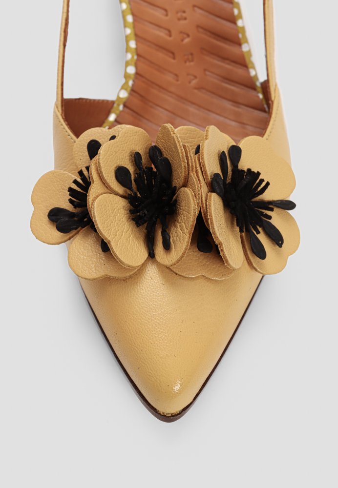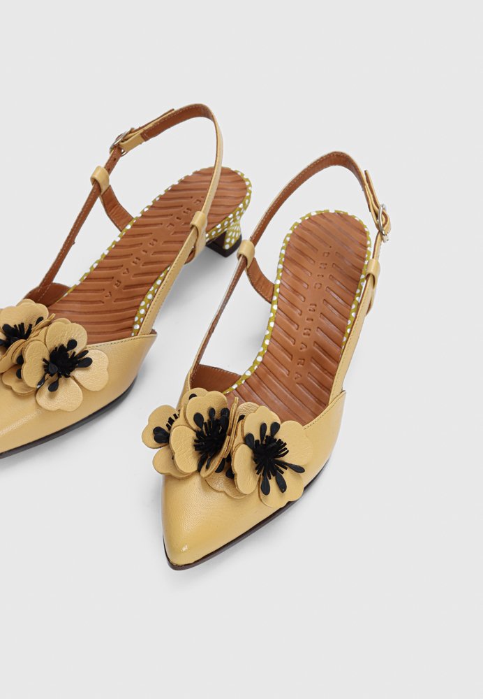 Charmerende slingback i blødt gult læder med dekorativ blomsterdetalje, der giver et romantisk og legende udtryk. Den åbne slingback-model sikrer en let og feminin silhuet, mens den stabile hæl gør den komfortabel hele dagen. Perfekt til sommerens kjoler og feminine outfits med personlighed.