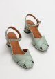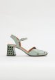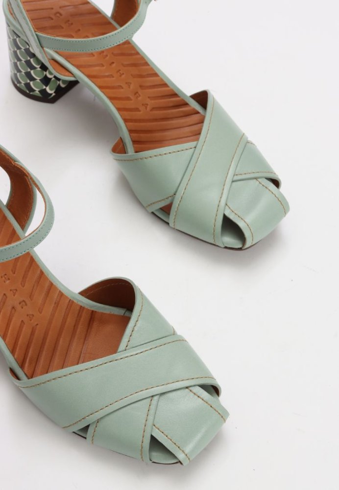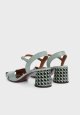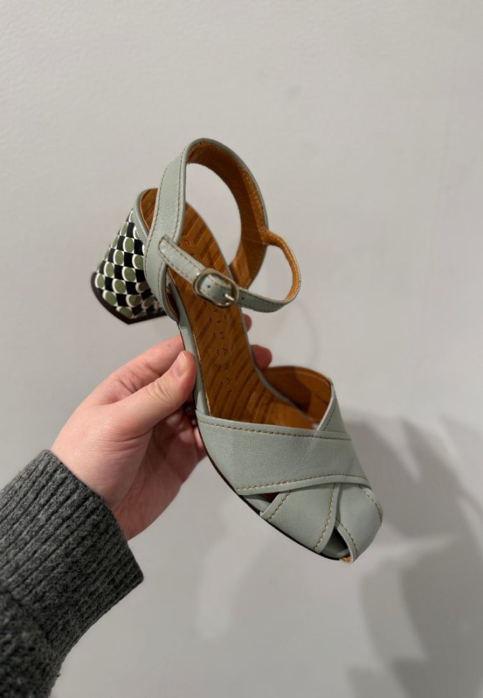 Let og elegant sandal i en frisk lyseblå nuance, der tilfører garderoben et feminint og moderne udtryk. De brede remme over forfoden giver god komfort og støtte, mens den mønstrede hæl skaber et unikt designstatement. Ideel til både hverdag og fest, hvor du ønsker et stilfuldt, men afslappet look.