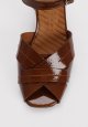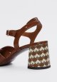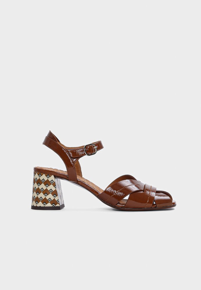 Elegant sandal i cognacfarvet læder med flettede remme og en karakterfuld hæl med grafisk mønster, der tilfører et moderne twist. Den feminine silhuet kombinerer komfort og stil, mens ankelremmen sikrer en stabil pasform. Perfekt til både sommerens festlige anledninger og hverdagslooks, hvor du ønsker et sofistikeret udtryk.