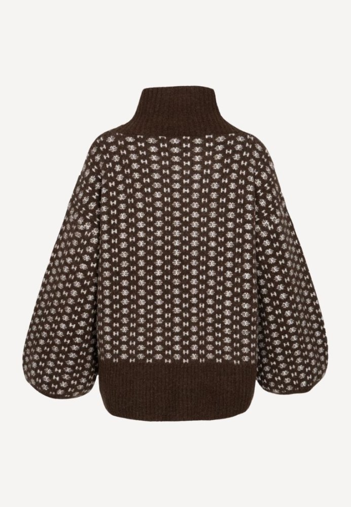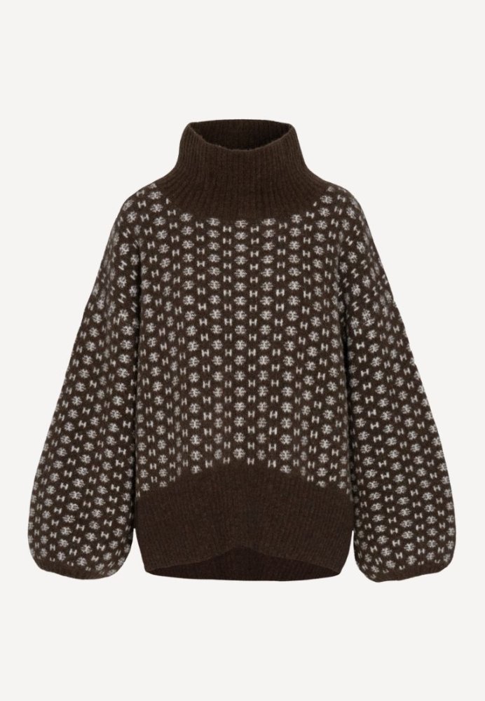 Logo Sweater fra Hést i farven Dark Earth er en moderne og luksuriøs strik med høj hals og et tydeligt H-logo i all-over mønster. Sweateren er fremstillet i en blød uld- og alpakablanding med stræk, som giver både komfort og formstabilitet. Den har et skulpturelt snit med kortere front og længere ryg – et stilfuldt statement piece til efterår og vinter.